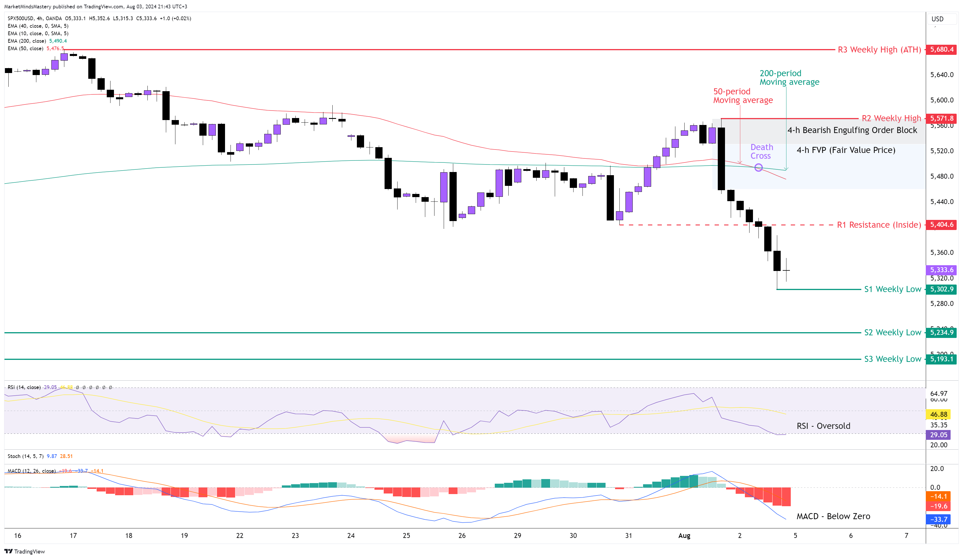 Conversely, if the price moves upwards, the first resistance area, R1, will be an Inside resistance around $5404. In case the price surpasses the R1 and keeps moving upwards, the next resistance area, R2, will be the previous week’s high at around $5571. As shown on the chart, the R1 level is a significant one because it caused the creation of an FVP (Fair Value Price) and a 4-h Bearish Englulfing’s Order Block. A further upward movie will find the R3 resistance at $5680, which is the ATH (All-Time High).