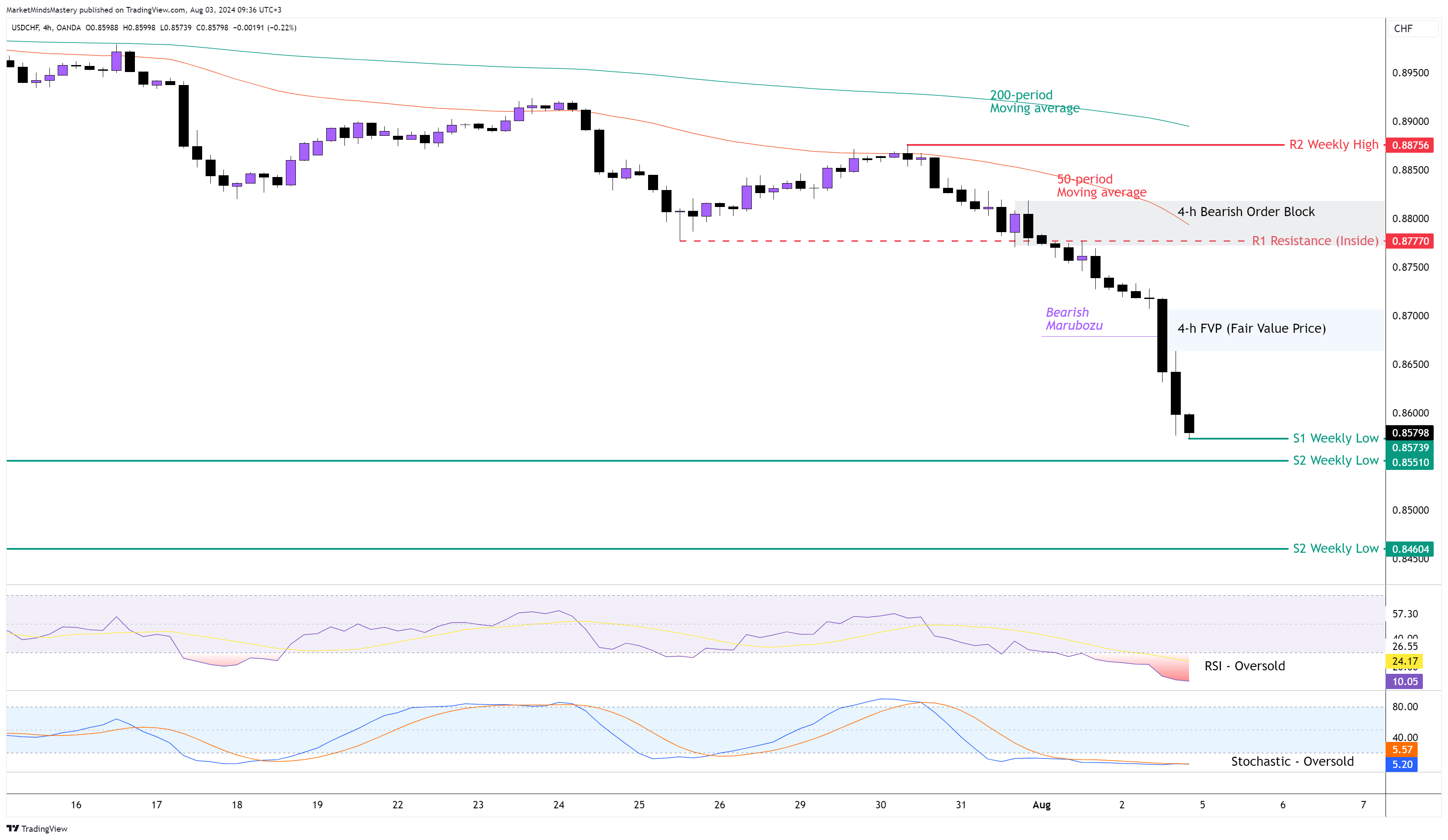 The Swissy’s appreciation last week set the USDCHF to drop significantly on Friday after the NFP was reported. The currency pair was in a well-defined downtrend, and the negative news in the US was the determining factor in the price decline. As per the swing analysis, the price makes lower highs and lower lows, and the downtrend is still valid. The 50-period is below the 200-period moving average, and the distance between them widens, and the price falls under heavy trading volume. The Bearish Marubozu candle was created last Friday at the NFP announcement, caused the creation of an FVP(Fair Value Price). The RSI and the Stochastic Oscillators are both in an Oversold Condition, and this has bearish implications.