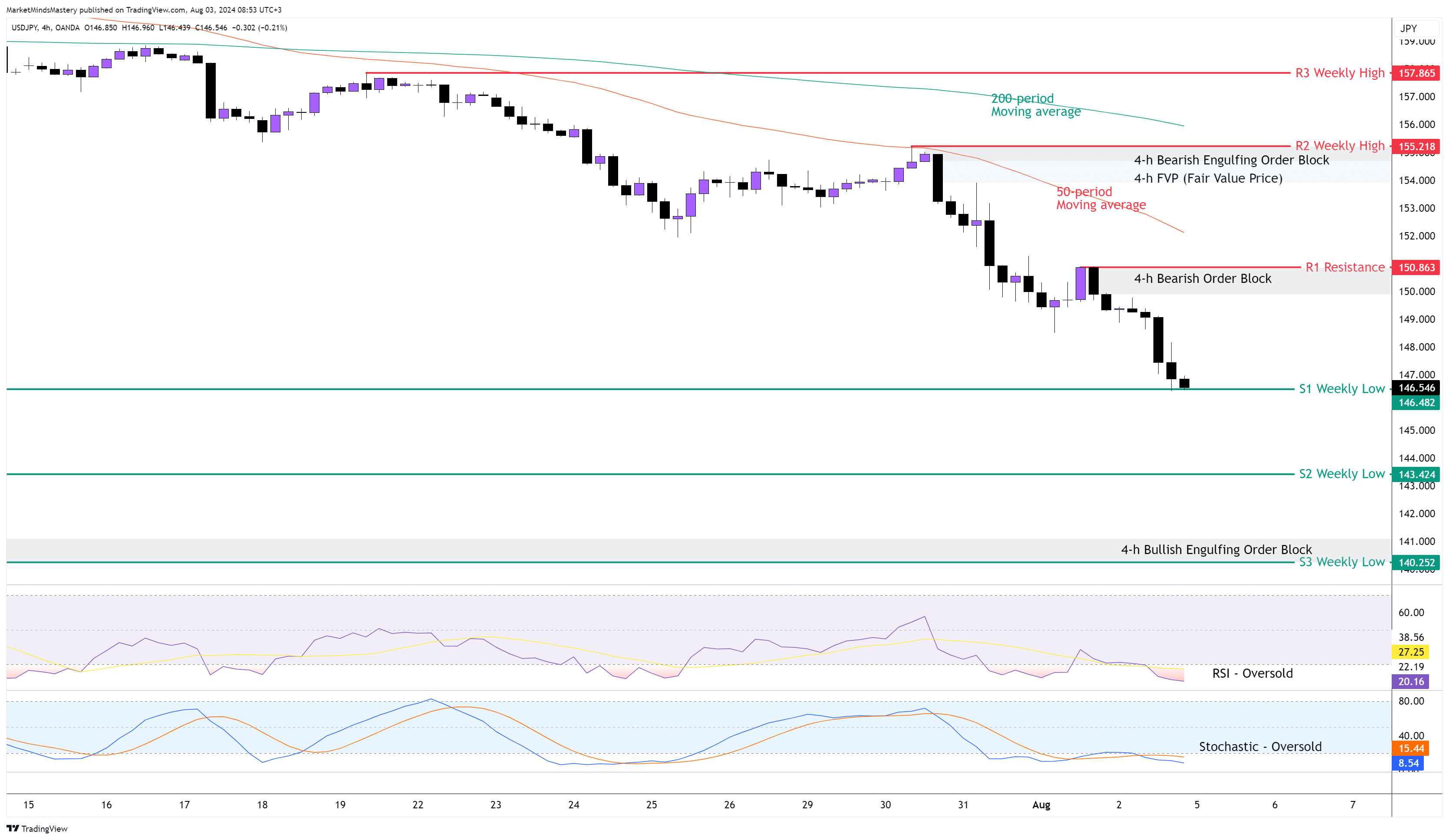 Following the previous week’s price decline, the price entered into the FVP (Fair Value Price) we pointed to on the previous week’s Market Outlook and then declined under a strong downtrend. Observing the candlesticks on the 4-hour chart, we see the black candles( Bearish) being much more and the Bullish candles also having a longer price range. This is an indication of a strong downtrend. This massive price drop of almost 900 pips over the week occurred in the first place once the Bank of Japan decided to increase their interest rates at the same time when all the other major banks dropped or kept unchanged their deposit rates. The 50-period is below the 200-period moving average, and this is bearish. The RSI and the Stochastic Oscillators are both in an Oversold condition, indicating a strong price fall. The price keeps making lower highs and lower lows, and as per the swing analysis, the downtrend is still intact. Last Friday, the price didn’t create a reversal candle or a swing low. Therefore, it is not possible to measure a potential Fibonacci retracement at the moment. If the price keeps moving downwards, the first support area, S1, will be the previous week’s low, around 146.48. This is almost the same price level as the previous week’s candle’s closed price. If the price penetrates the S1 and declines further, the next support area, S2, will be another weekly low, around 143.42.