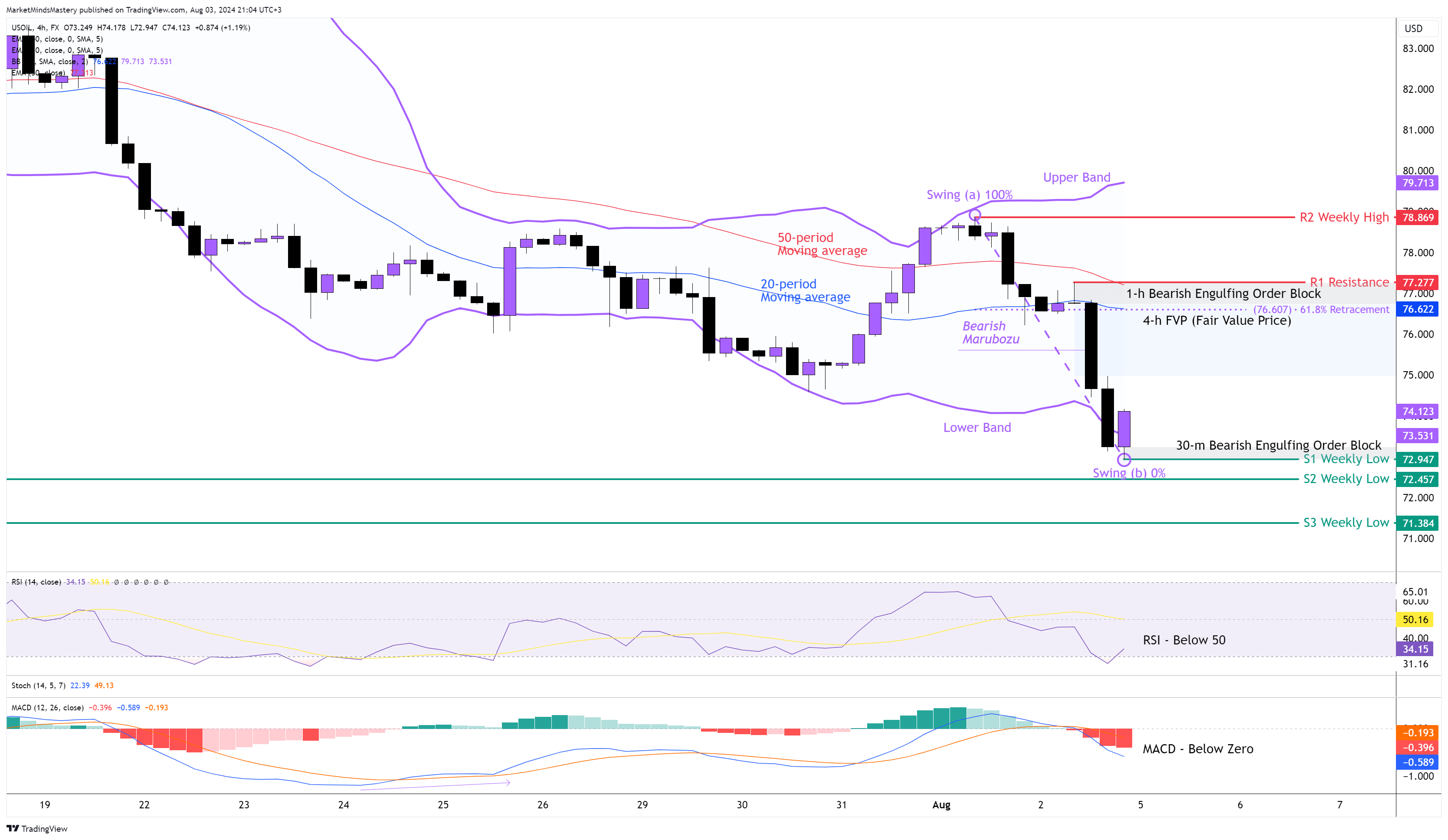 Additionally, the RSI OScillator is below 50, and this is also bearish. The MACD crossed below its zero line, indicating the price decline. The MACD’s Histogram is below zero, and this confirms the price decline. If the price continues its downward move, the first support area, S1, will be the previous week’s low, around $72.94. If the price penetrates the S1 and keeps lowering, the next support area, S2, will be $72.45. A further downward move finds the S3 support, around $71.38. In case the price moves upwards, the first resistance R1, will be above the 1-hour Bearish Engulfing Order Block around $77.27. The $77 area is considered a significant price level because it consists of the R1 resistance, the FVP and the 61.8% Fibonacci retracement level from swing (a) to swing (b), as shown on the chart. If the price penetrates R1 and keeps moving upwards, the next resistance area, R2, will be the previous week’s high at around $78.86.