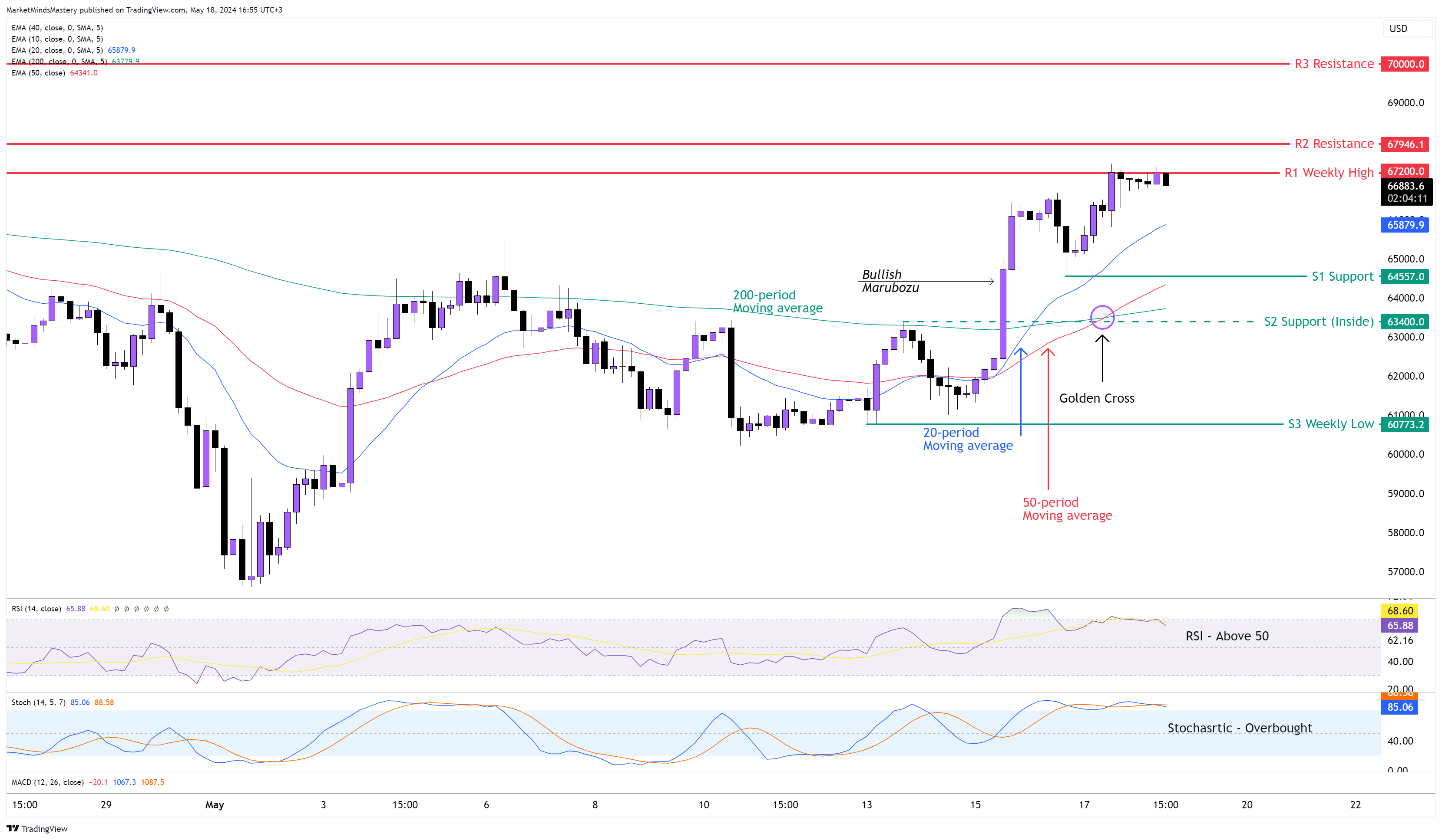 The primary weekly uptrend resumed after the price made a new high. On the 4-hour chart, the price created a well-defined uptrend with a series of higher highs and higher lows. The Bullish Marubozu candle signalled the confirmation of the uptrend as the price broke the $63400 under a significant volume as the Bullish Marubozu candle reveals. The 20-period crossed above the 50-period, and the 50 crossed above the 200-period, creating the Golden Crossover. The RSI is above 50, indicating a bullish market, whereas the Stochastic confirms the bullishness because it is in an overbought condition. If the price keeps trading upwards, the first resistance area, R1, will be the previous week’s high, around $67200. This is close to R2, the next resistance area, at around $ 68,000. A price close to $68000 can set the price to retest the $70000, which is the R3 resistance. On the other hand, if the price moves downwards, the first support S1 is around $64550, which is the beginning of the last impulsive upward move. If the price closes under the S1 and moves lower, the next support, S2, will be approximately $63400. This level is considered significant because it finds the 200-period moving average and the broken resistance, which now will act as support, and is the middle of the Bullish Marubozu candle, which usually hosts a significant amount of volume of the candle.
