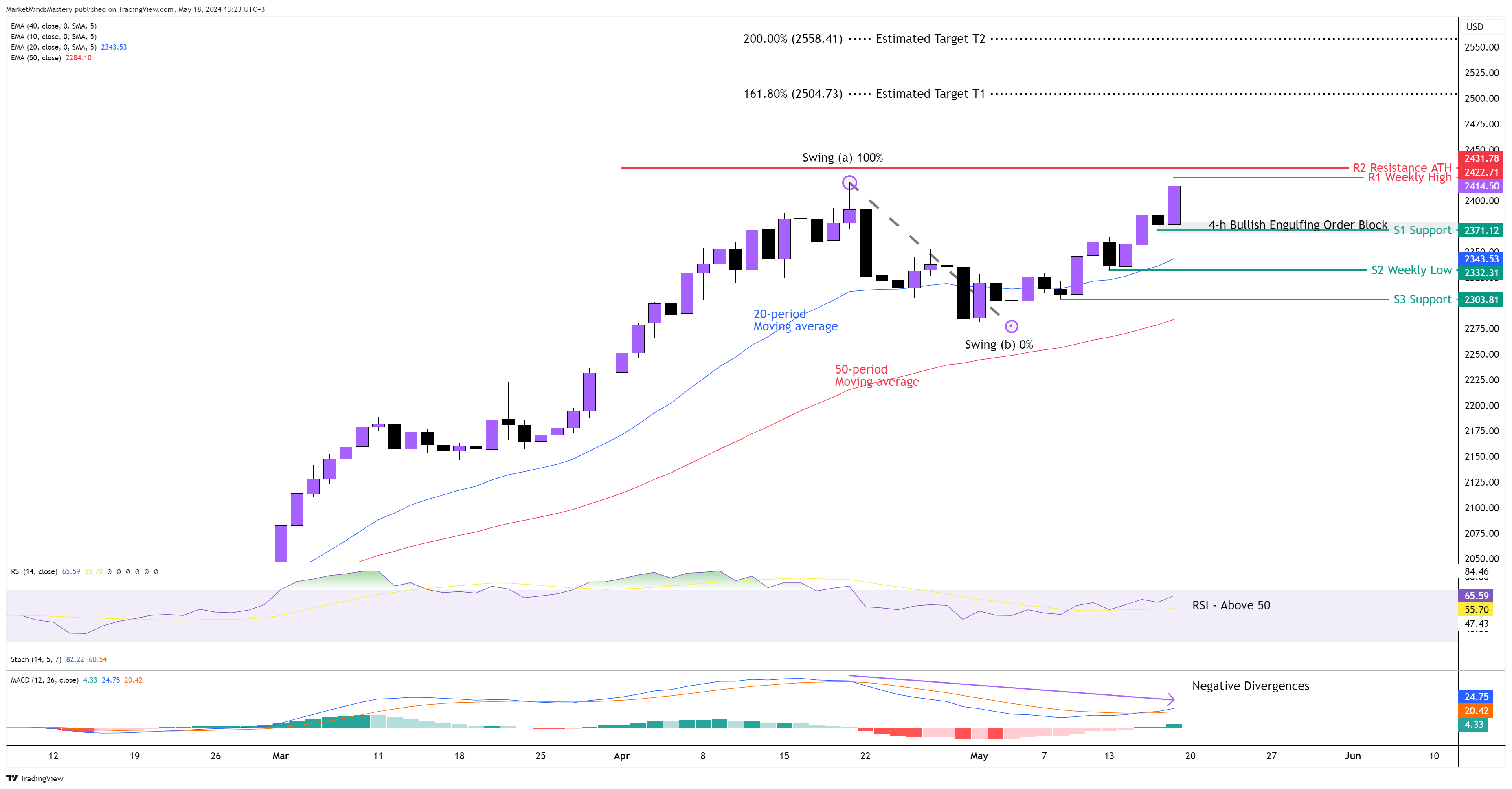 The uptrend in the Gold market continued last week, with the retracement occurring exactly at 61.8%, as we pointed out in the previous week’s analysis (Market Outlook GOLD 4H 13-19/5). Since then, the price rally has continued the Higher Highs and Higher Lows series. This week, we will analyse the Daily chart since the price is approaching an ATH (All-Time High). As the market is in a strong uptrend, the 20-period is above the 50-period moving average, with the distance between them widening. The RSI is well above the 50, which is a bullish sign. The MACD, as it takes the 24 periods into account, is considered a slower indicator than the RSI. Therefore, the MACD shows noticeable Bearish or Negative Divergences B’ Class, which means that the price made equal top and the MACD lower high. This indication can set the price on a set-back, at least temporarily. If the price continues moving upwards, the previous week’s high should be violated, and a close above the R1 resistance, which is around $2422, should occur. If this happens, the ATH, as marked on the chart with the R2 resistance, is around 200 pips above the $2431. If the price breaks above the ATH, then using the Fibonacci Extension, we marked 161.8% and 200%.