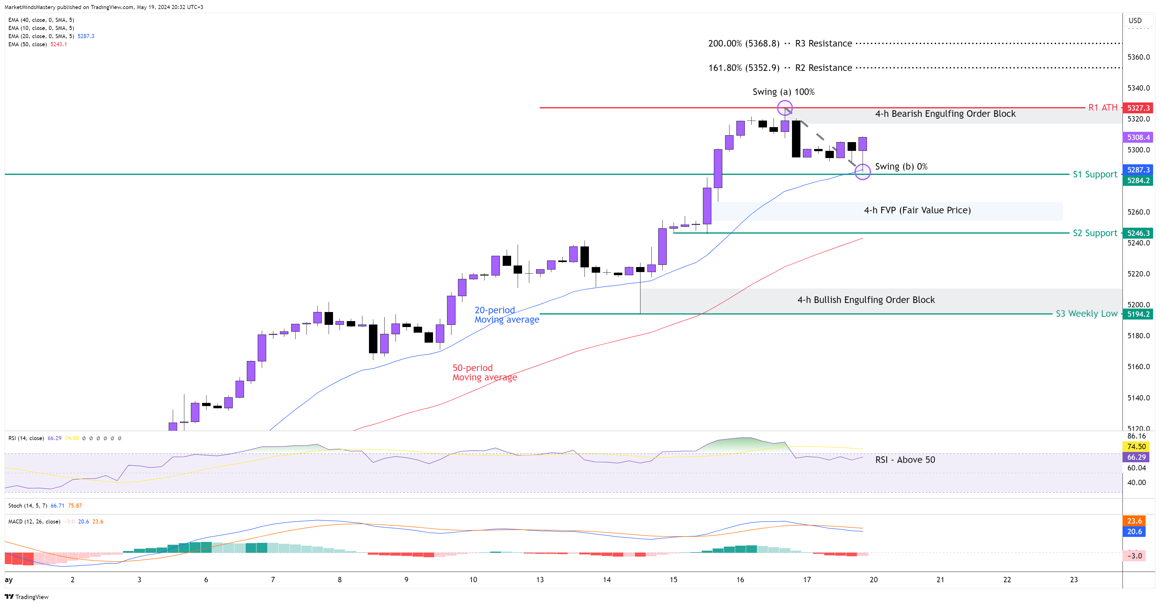 If the price is rejected and moves downwards, the first support area, S1, is expected to be around $5284. If the price doesn’t bounce off from the S1 and declines further, the next support area S2 will be the $5246. The market created an FVP, which is likely to be filled.