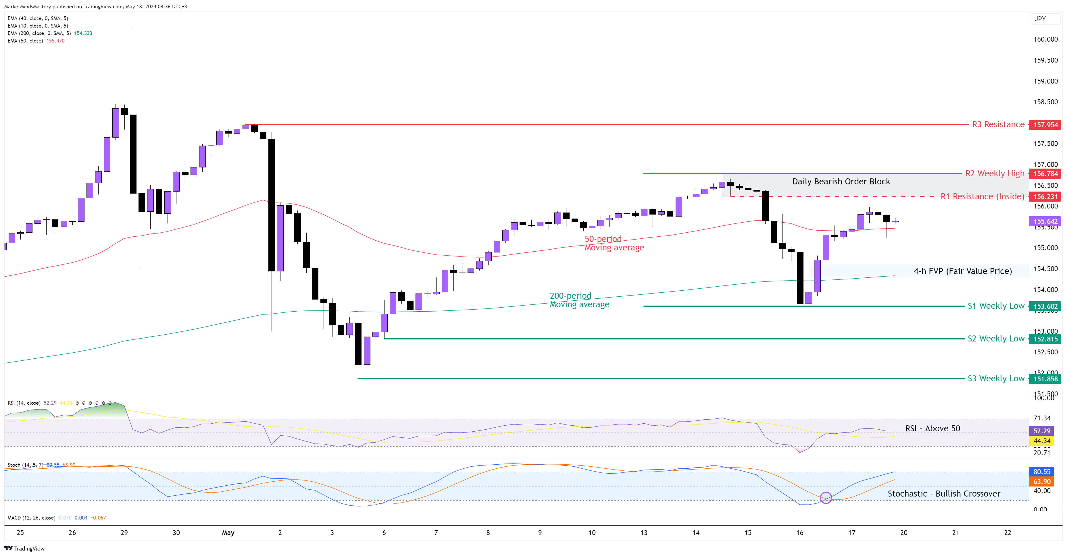 Following the successful test of the Bullish Engulfing Order Block last week, the price bounced off and moved upwards as expected to continue the upward trending move. Last week’s price action formed a long-legged doji candle. Despite this, the price made a higher high and high low formation. On the 4-hour chart, the 50-period moving average is above the 200-period moving average, which is a bullish indication. The RSI is over 50, and the Stochastic created a Bullish Crossover. Starting Monday, if the price continues moving upwards, the first resistance, R1, is an inside resistance of around 156.23. The next resistance is R2, which was the previous week’s high at around 156.78. Within the R1 and R2 is a Bearish Order Block formed on the Daily chart.