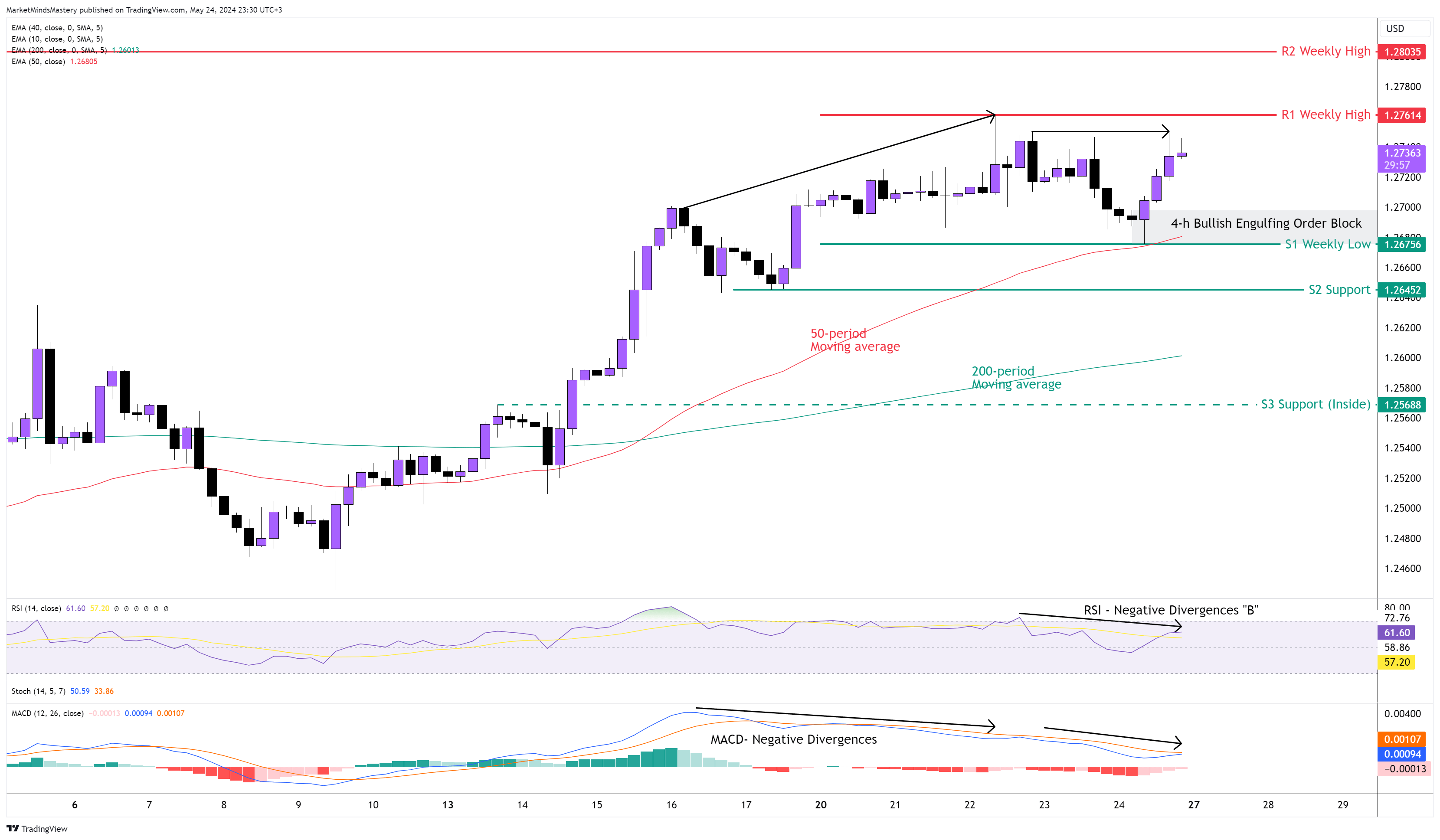 At this level, a Bullish engulfing Order Block formed last week. Also, the interaction of the 50-period moving average can add additional validation. If the price doesn’t bounce off and declines, the next support area, S2, will be around 1.26452. A further downward move will change the market structure, and the S3 support will be around 1.25688. If the price moves upwards, the previous week’s high will be considered as the first resistance, R1, approximately at 1.27614, and the following resistance, R2, approximately 1.28035. Both these resistance levels are weekly highs.