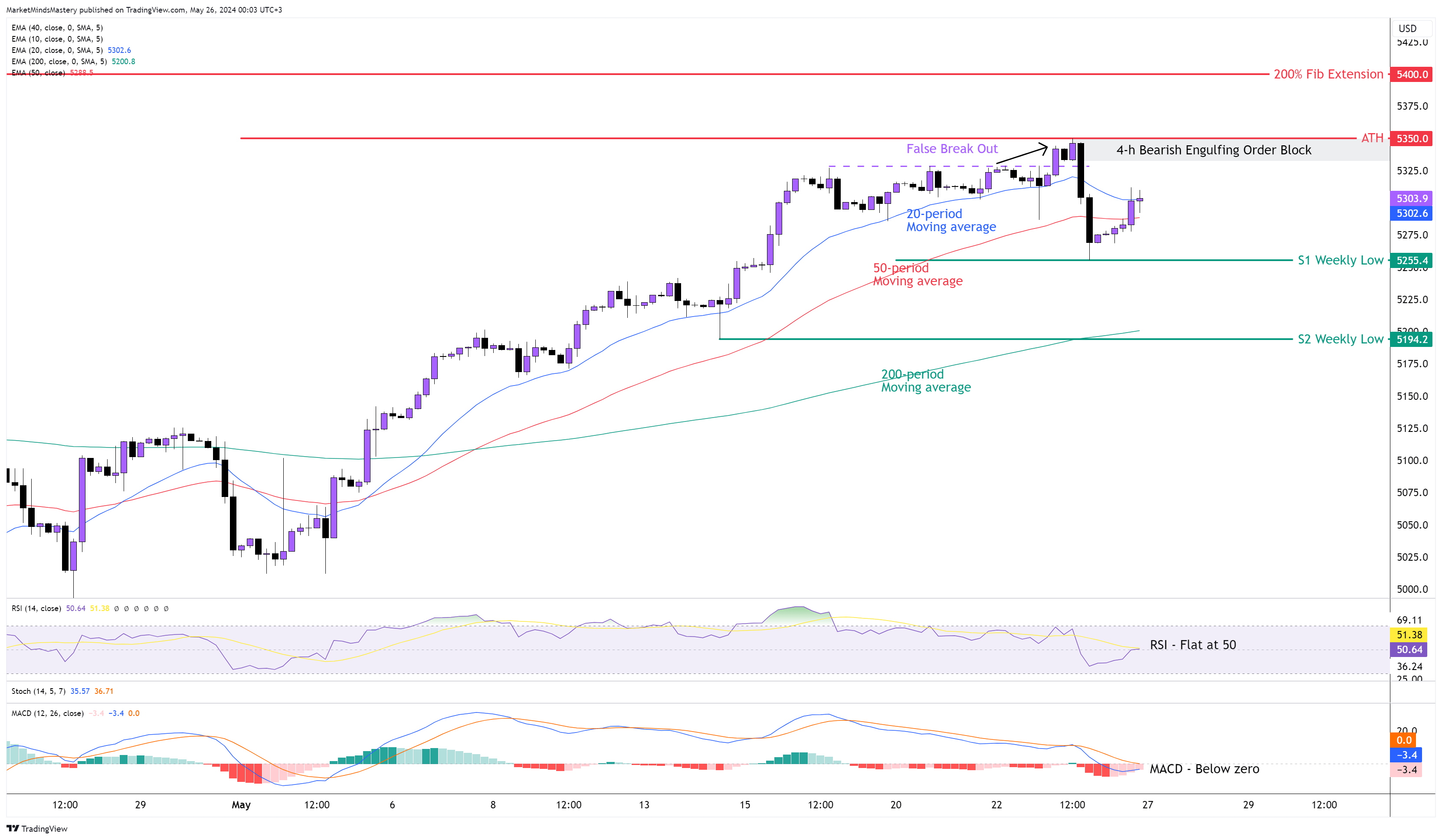 The primary uptrend on the SP 500 continues, and the previous week, the market closed with a new All-Time High (ATH) around $5350. This is a significant price for the Index despite the weekly candle created last week being a doji. A doji candle is not considered a reversal price action in candlesticks analysis. However, when it is found after a few bullish candles, it usually starts the price correction. On the 4-hour chart, the price showed a strong sell-off on Thursday during the New York Trading session with the two long black candles. Despite that, the 20-period moving average is above the 50-period, and both are above the 200-period moving average. This setup indicates the trend is upward. As the price hasn't created the structure of lower highs and lower lows, we can't define a downtrend.