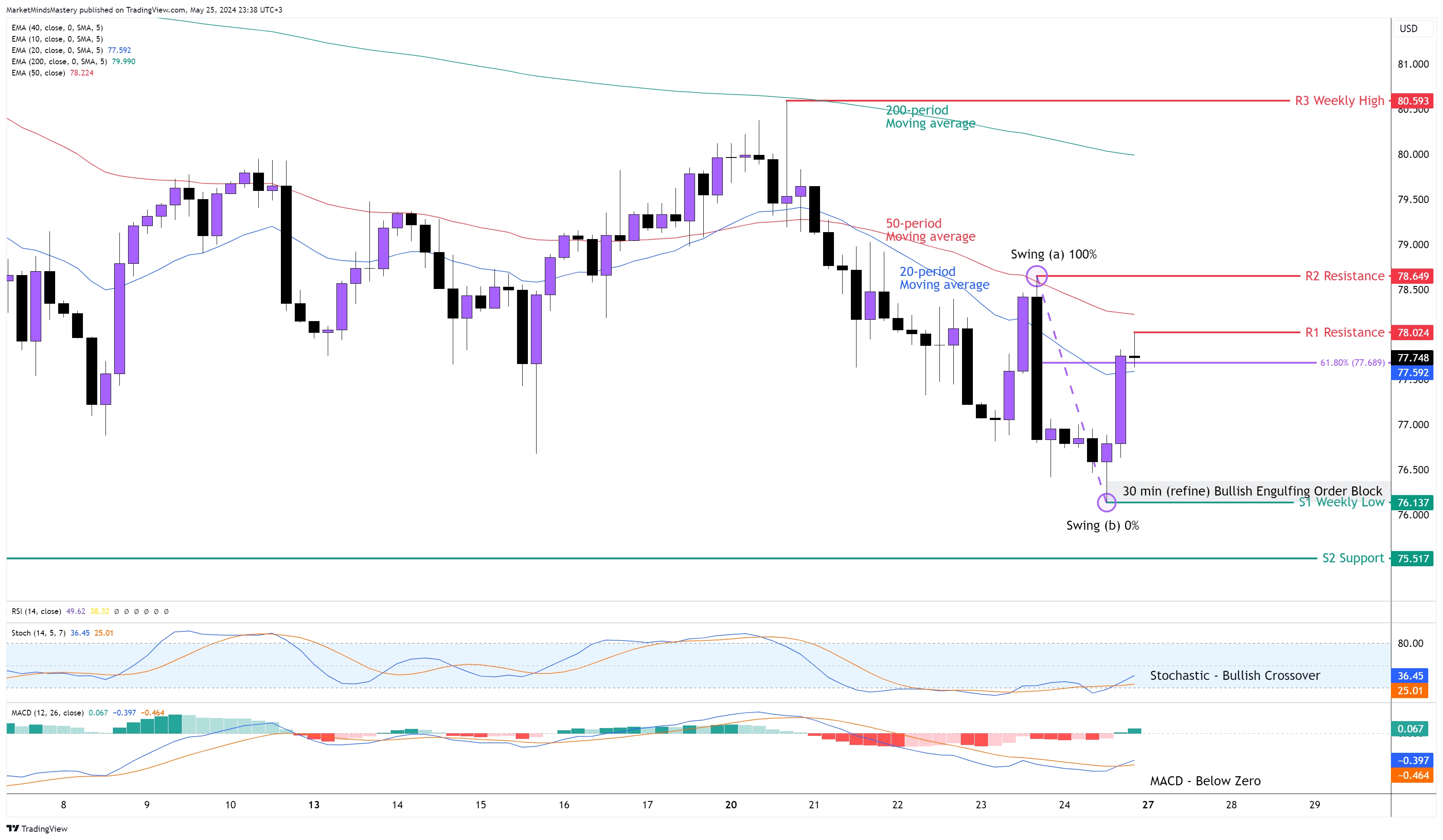 The Bullish Engulfing on the weekly chart didn’t follow through last week, and the price was rejected and moved downwards, resuming the 4-hour downtrend. The 20-period crossed under the 50-period moving average, confirming the downtrend. The 200-period is above both the 20 and the 50 in a wide distance. The Stochastic recently became oversold, and now the fast line crossed above the slow line, which has bullish implications. The MACD is under zero but with a Bullish crossover as the MACD line (blue) crosses above the Signal line (orange), which explains that the price is likely to be in a corrective phase. As the price makes lower highs and lower lows, it can be considered a downtrend. If the price continues downwards, the first support area, S1, will be the previous week’s low at $76.13. A Bullish Engulfing Order Block was created on the 30-minute chart, the marked area on the chart above.