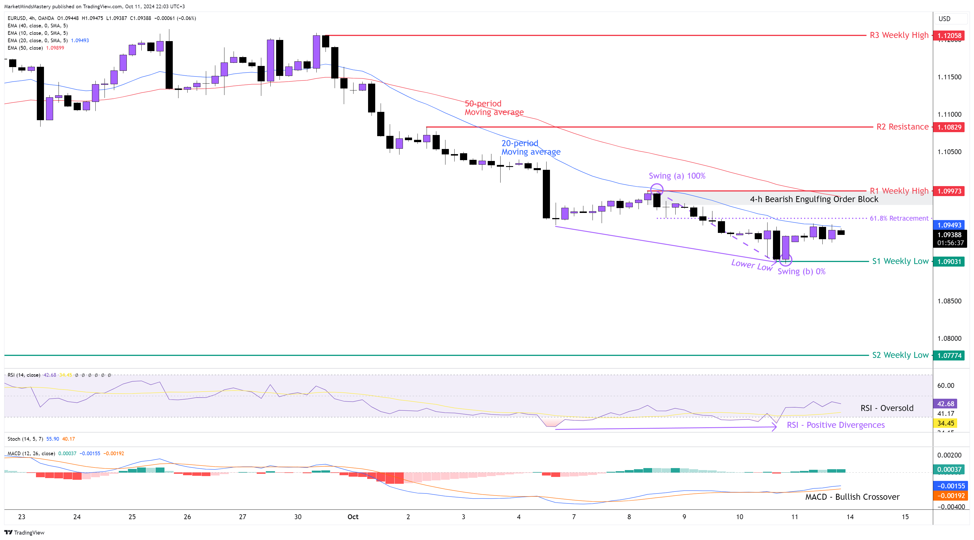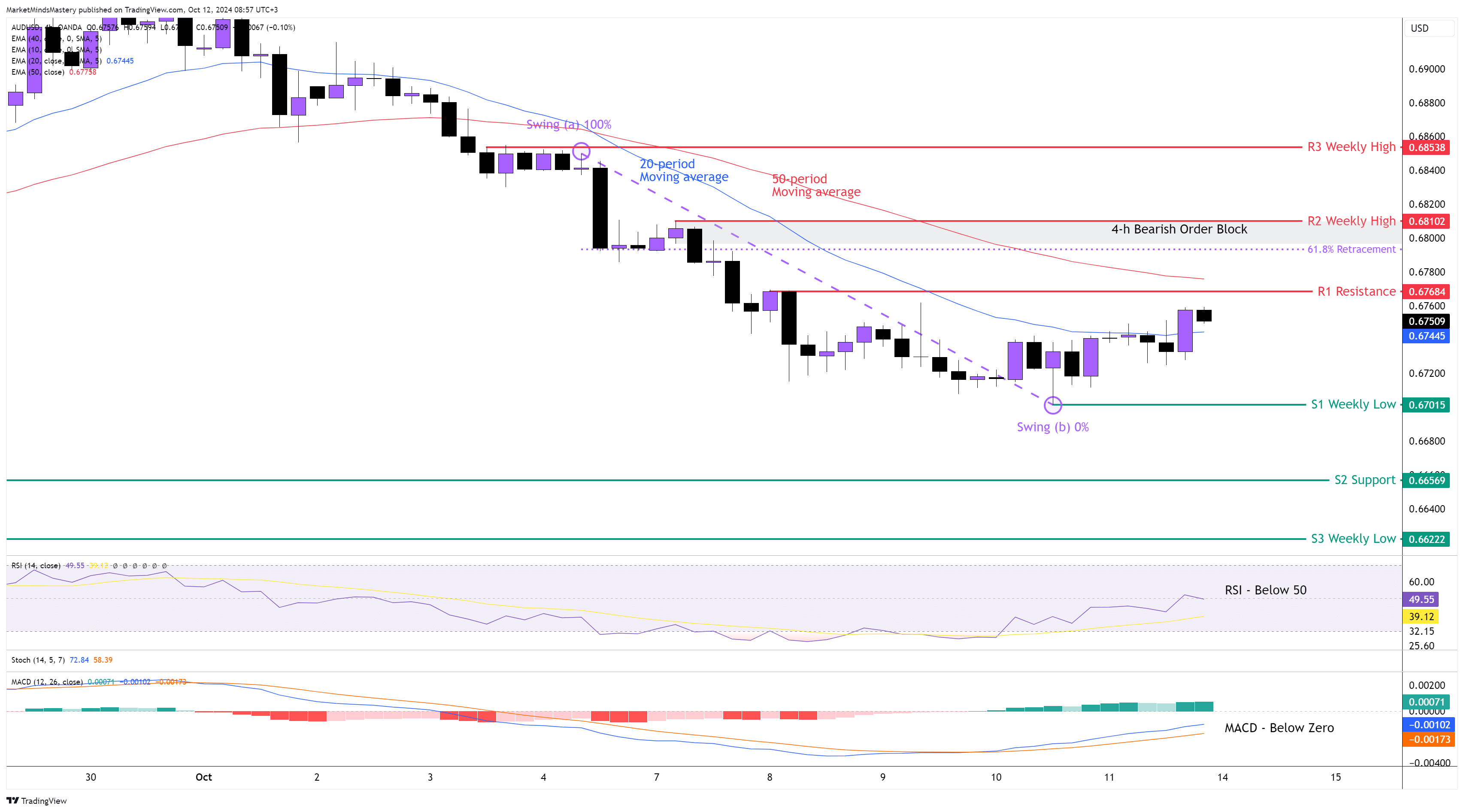 The downtrend started at the beginning of October and continued last week as the US Dollar was gaining more strength across the currencies board. The weekly chart created a new lower high and lower low formation. On the 4-hour chart, the 20-period remains below the 50-period moving average, which is bearish. The RSI Oscillator is below the middle line of 50, which is also bearish. The MACD is below the zero line, indicating bearishness. The MACD’s Histogram is above its zero line, indicating that the price entered a retracement phase. Hence, if the price continues its retracement and keeps moving upwards, the first resistance area, R1, will be around 0.67684, which is approximately 200 points (20 pips) below the current price. If the price penetrates the R1 and keeps moving upwards, the next resistance area, R2, will be around 0.68102. This is a key level of resistance because it is the previous week’s high, it also created a Bearish Order Block last week and because the Fibonacci Golden Ratio of 61.8% measures the price move from the swing high at point (a) until the swing low at point (b) is around this price level.