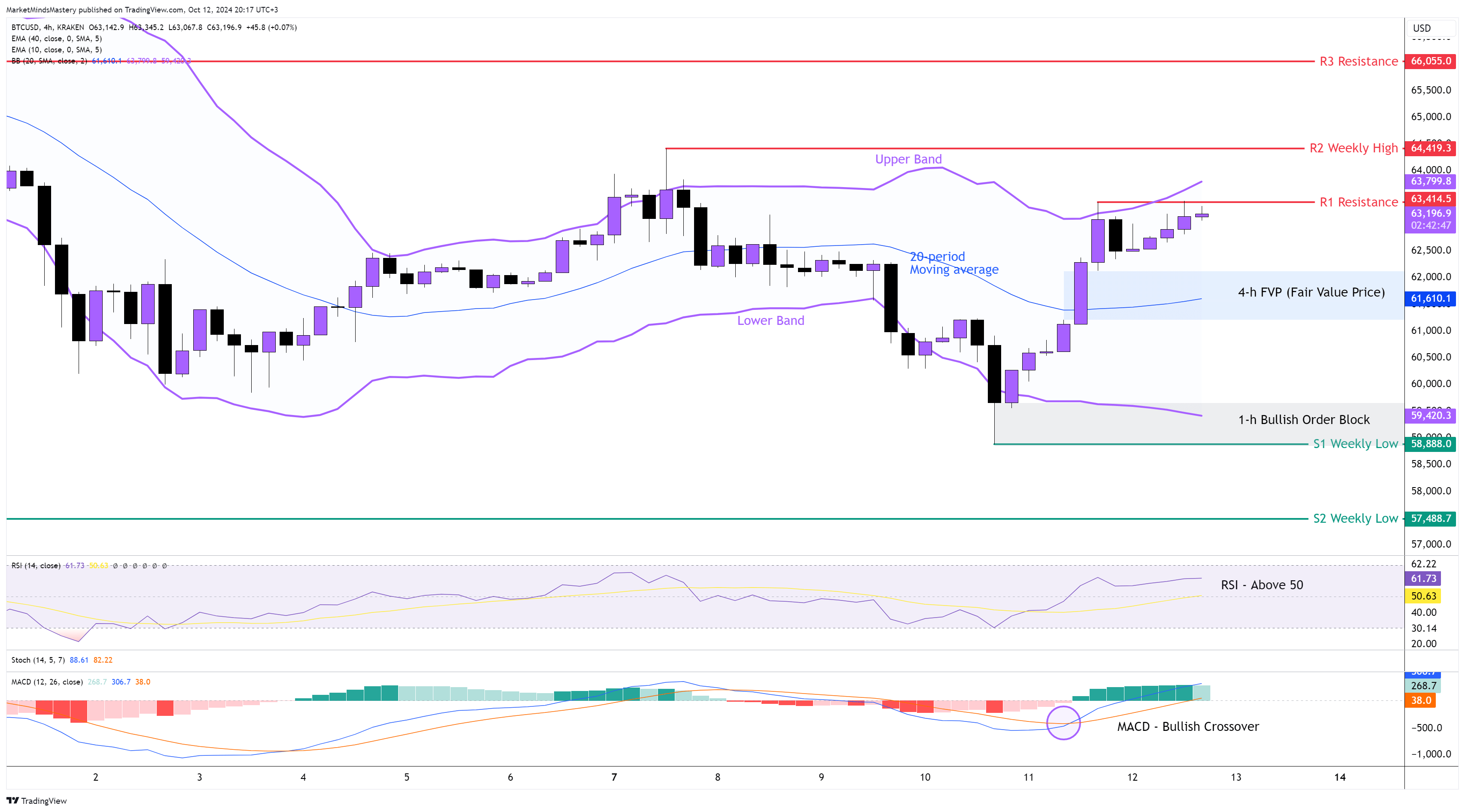 On the other hand, if the price moves downwards, it will enter into the FVP (Fair Value Price) around $61600. If the FVP rejects the price and keeps declining, the first support area, S1, will be at $58888, which is the previous week’s low. At this price level, last Thursday, a Bullish Order Block was created, and it can become an additional support for the price. If the price penetrates the S1 and keeps moving downwards, the next key level of support, S2, will be the $57488.