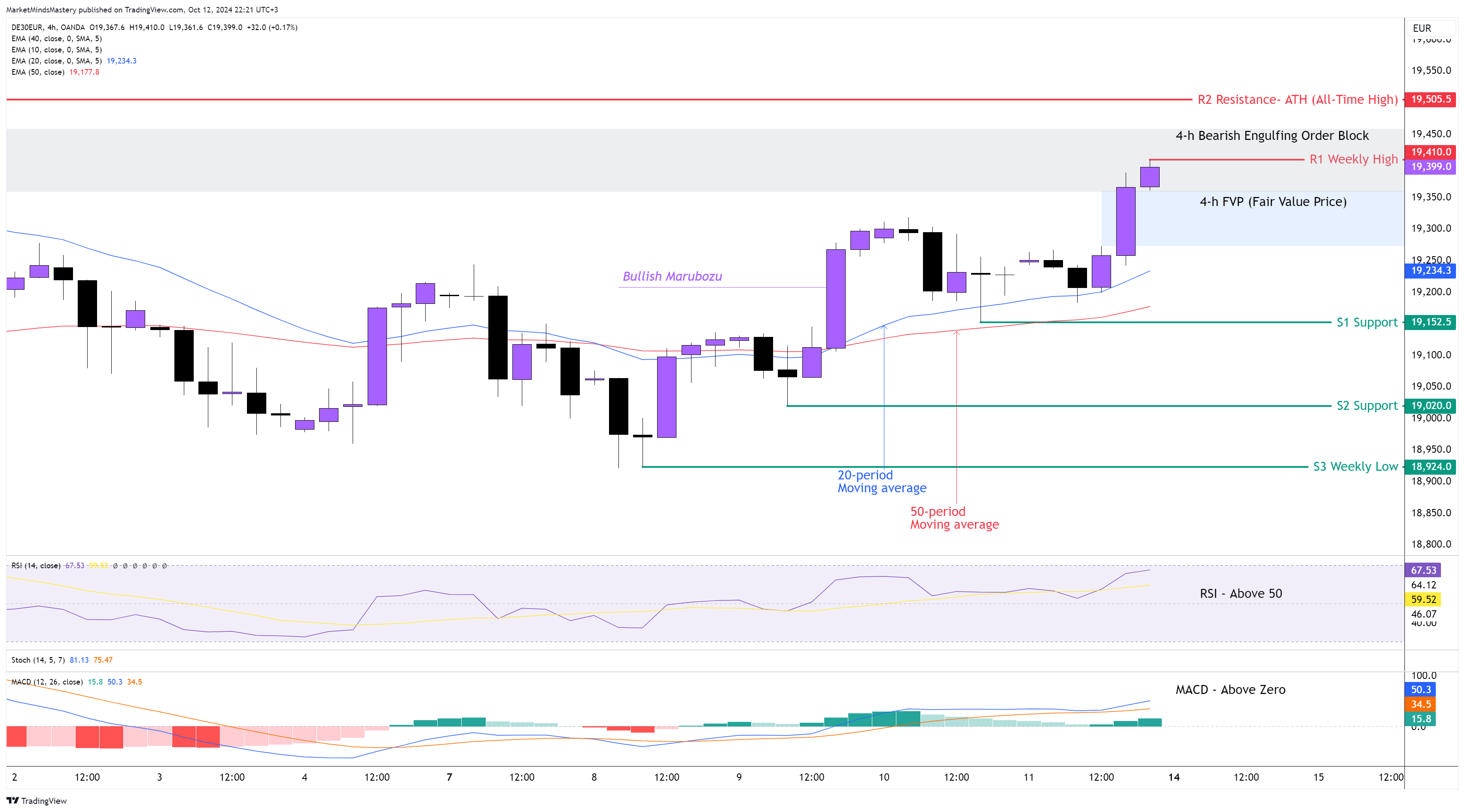 Last week, the European indices successfully tested all the price levels we mentioned in the previous week’s Market Outlook. Last Thursday, the price created a higher high formation around 19300 with a Bullish Marubozu candlestick pattern. That bullish momentum held until the end of last week, creating a Bullish candle with a Long Lower Wick on the weekly chart. On the 4-hour chart, the 20-period is above the 50-period moving average, which has bullish implications. The RSI is above its middle line of 50, and this is bullish. The MACD is above the zero line, and this has bullish implications. The MACD’s Histogram is rising, indicating the price is moving upwards. Currently, the price is above the 20-period moving average, and it is within the Bearish Engulfing Order Block area of around 19400. Therefore, if the price is rejected from this area and moves downwards, the first support area, S1, will be around 19152. In case the price penetrates the S1 and keeps moving downwards, the next support area, S2, will be approximately 19020. If the price surpasses the S2 and keeps lowering, the next support area, S3, will be at 18924, which is the previous week’s low.