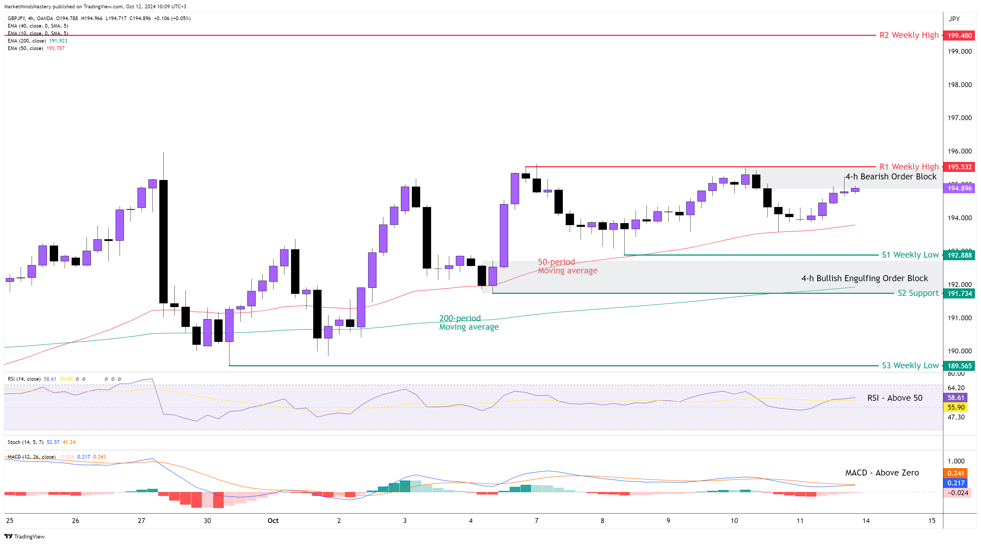 Although the price didn't create a directional move last week, the price mitigated the FVP (Fair Value Price) we pointed out in last week’s Market Outlook. Then, it bounced off and moved upwards, offering a high probability of tradable opportunities for traders. The weekly chart ended with a Hanging Man candlestick pattern, which is considered a reversal price action when found in residential areas. On the 4-hour chart, the 50-period is above the 200-period moving average, and this has bullish implications. The RSI Oscillator is above its middle line of 50, and this is bullish. The MACD is above zero, which is bullish. The price maintains its higher low formation, but it doesn’t make higher highs. Currently, the price is around the Bearish Order Block that was created last Friday. Therefore, if the price is rejected and moves downwards, the first support area, S1, will be around 192.888, which is the previous week’s low. If the price surpasses the S1 and keeps moving downwards, the next support area, S2, will be at 191.734. This is considered a key level of support because the price coexists with the Bullish Engulfing Order Block created a few weeks ago and the 200-period moving average. If the price penetrates the S2 and keeps lowering, the next support area, S3, will be at 189.565, which is the previous week’s low. Oppositely, if the price moves upwards and penetrates the Bearish Order Block around 195.000, the first resistance area, R1, will be approximately 195.532, which is the previous week’s high. If the price penetrates the R1 and keeps moving upwards, the next resistance area, R2, will be around 199.480, which is an old weekly price level.