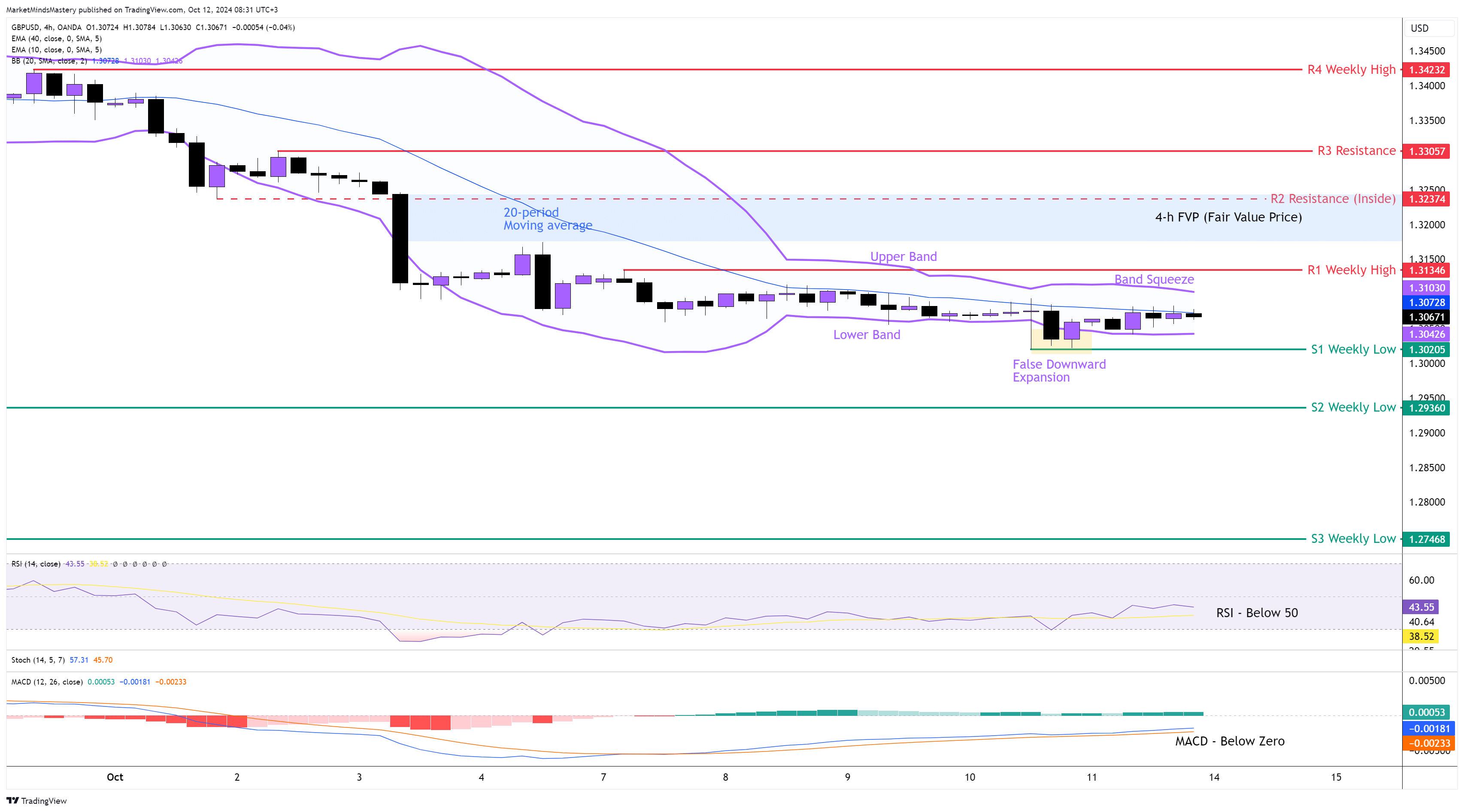 Last Monday, the price of the GBPUSD was rejected at around 1.31300, which was the Bearish Engulfing Order Block area. It then moved downwards until it reached the S1 weekly support we pointed out in the chart in last week’s Market Outlook. Hence, the weekly candlestick’s body has a range of only 430 points(43 pips). This is an insignificant price move for this currency pair based on the ATR (Average True Range) indicator. On the 4-hour chart, the price remains within the boundaries of the Bollinger Band indicator. Last week, the Upper Band wasn’t touched as the price remained below the 20-period moving average, which is the middle of the Bollinger Band. The RSI is below its middle line of 50, indicating bearishness. The MACD is also below its zero line, which is bearish. Currently, the Bands are Squezze and a directional move to the upside, or the downside will be noticeable, and the volatility is expected to expand. Starting Monday, if the price keeps moving downwards, the first support area, S1, will be around 1.30205, which is the previous week’s low. If the price penetrates the S1 support and keeps lowering, the next support area, S2, will be around 1.29360.