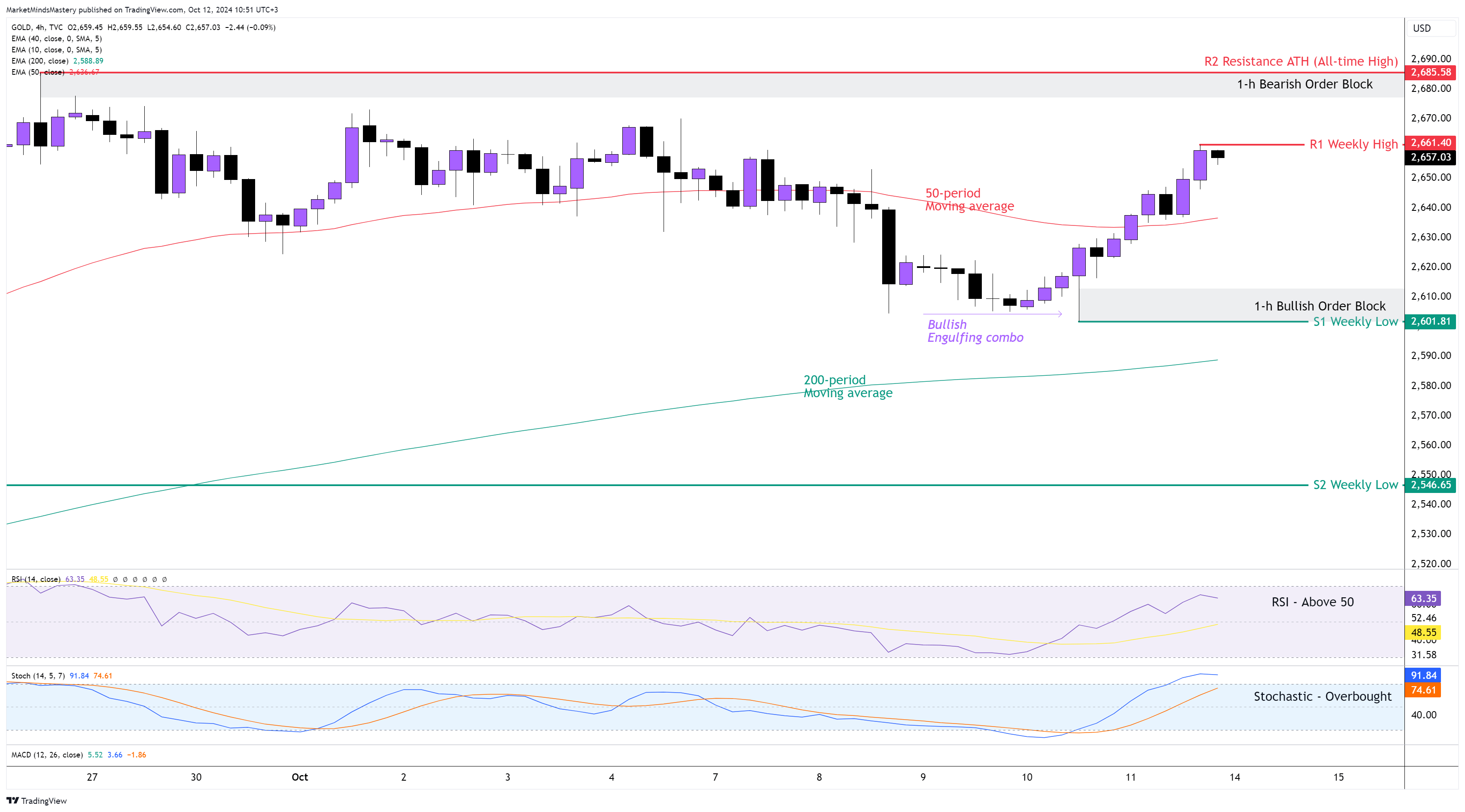 Last week, the price of GOLD moved below $2625, which is the low of the weekly candle we mentioned in last week’s market analysis. However, by the end of last week, the price rebounded, moved upwards, and closed as a Bullish Candle with a Long Lower Wick. This shows that the price of Gold wants to hover around its ATH (All-time high) for one more week. Analysing the 4-hour chart, the 50-period remains above the 200-period moving average, which is bullish. The RSI is above 50, indicating bullishness. The Stochastic Oscillator is in its Overbought Condition, and this has bullish implications. Based on the swing analysis and market structure, the price is trading within a long-term range that started three weeks ago. Currently, the price is above the 50-period moving average. Hence, if the price continues to move upwards, the first resistance area, R1, will be the previous week’s high, around $2661. If the price penetrates the R1 and keeps moving upwards, the next resistance area, R2, will be the ATH (All-Time High), approximately $2685. At this price level, a Bearish Order Block was created three weeks ago on the 1-hour chart. As it hasn’t been tested yet, if the price surpasses it, it will likely do so with a noticeable amount of volatility.