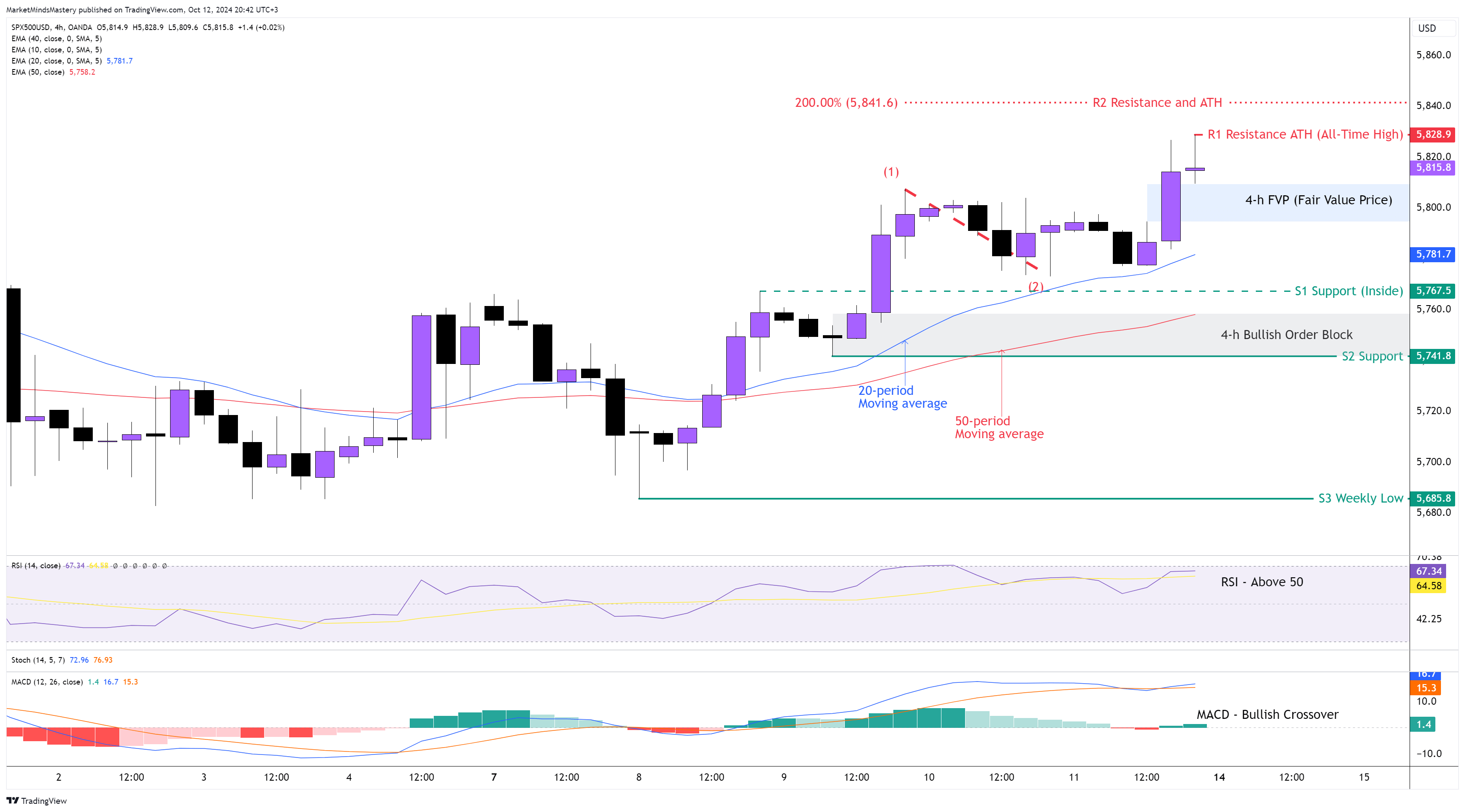 Last week, the price created a new ATH (All-time High) around $5830, which was the 200% Fibonacci Extension we pointed out in the previous week’s Market Analysis. That caused the MACD Line (Blue) to cross above the Signal Line (Orange) of the MACD indicator, which indicates bullishness. Simultaneously, the RSI Oscillator remained above its middle line of 50, which also has bullish implications. Currently, the price is above the 20-period moving average, which is also bullish. Last Wednesday, the price created a Bullish Order Block of around $5750 and last Friday, it created an FVP (Fair Value Price) of around $5800.