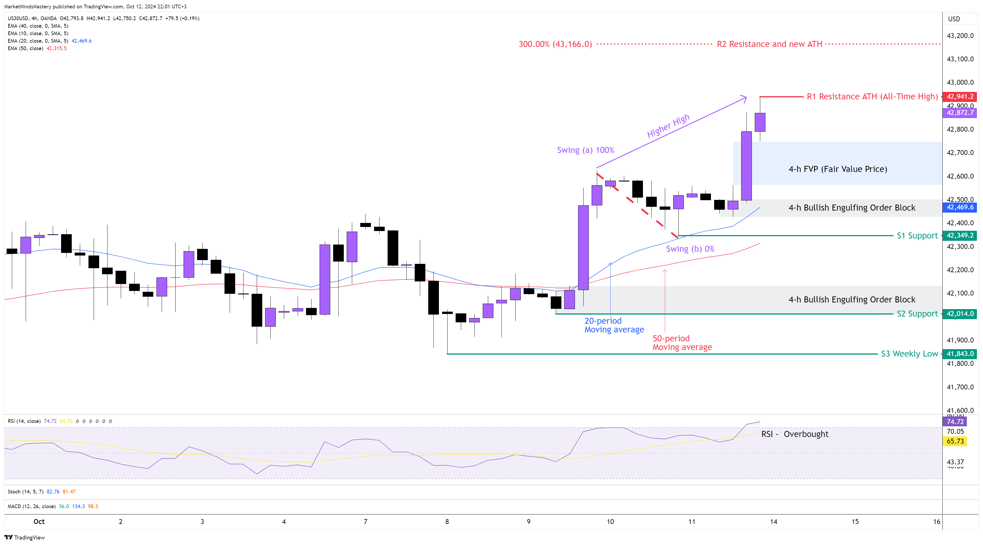 The momentum built up in the US30 last week was evident, and the volatility last Wednesday and last Friday was noticeable during the New York Trading Session. The price action on the weekly chart ended as a Bullish Engulfing, and the price created a new ATH (All-time High). Therefore, the RSI Oscillator entered into its Overbought condition, which has bullish implications. The 20-period is above the 50-period moving average, and this is also bullish. Last Friday, the price created a new higher high formation and also, around $42600, it created an FVP (Fair Value Price), which hasn’t been mitigated yet. Starting Monday, if the price is rejected and moves downwards, the first support area, S1, will be around $42349. Slidly above the S1, last Friday, the price created a Bullish Engulfing Order Block, which can become an additional support factor for the price. If the price penetrates the S1 and keeps moving downwards, the next support area, S2, will be around $42000. This is a key level of support as it coexists with a 4-hour Bullish Engulfing Order Block, which was created last Wednesday. In case the price penetrates the S2 and keeps lowering, the next support area, S3, will be at $41843, which is the previous week’s low.
