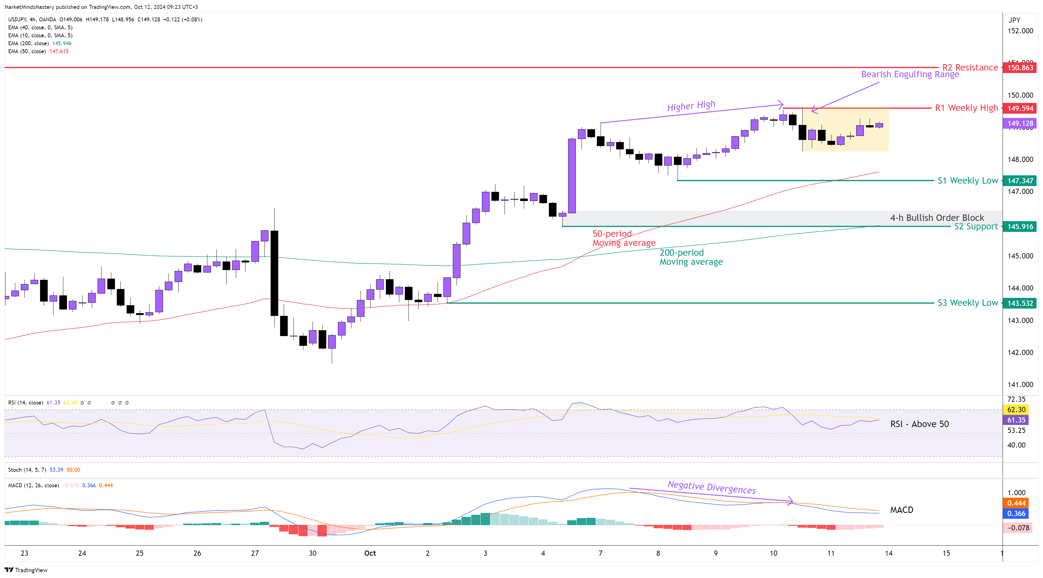 Despite the Bullish Engulfing reversal candlestick created on the weekly chart a week ago, the price of the USDJPY didn't move upwards noticeably last week. The currency pair created a Bullish Hammer, but the candlestick failed to close above the 40-period weekly moving average. On the 4-hour chart, the 50-period moving average remains above the 200-period moving average, which is bullish. The price created a higher high formation last Thursday, but the MACD failed to follow through, and it printed Negative (or Bearish) Divergences. This first means that the price most likely will start a retracement phase. As shown in the chart above, the high and the low levels of the Bearish Engulfing created around 149.500, which served as a price range for two days, and the price remained within the Bearish Engulfing boundaries. The RSI is above 50, and this has bullish implications. Therefore, if the price continues to move upwards, the first resistance area, R1, will be approximately 149.590, which is the previous week’s high. If the price penetrates the R1 and keeps moving upwards, the next resistance area, R2, will be around 150.863.