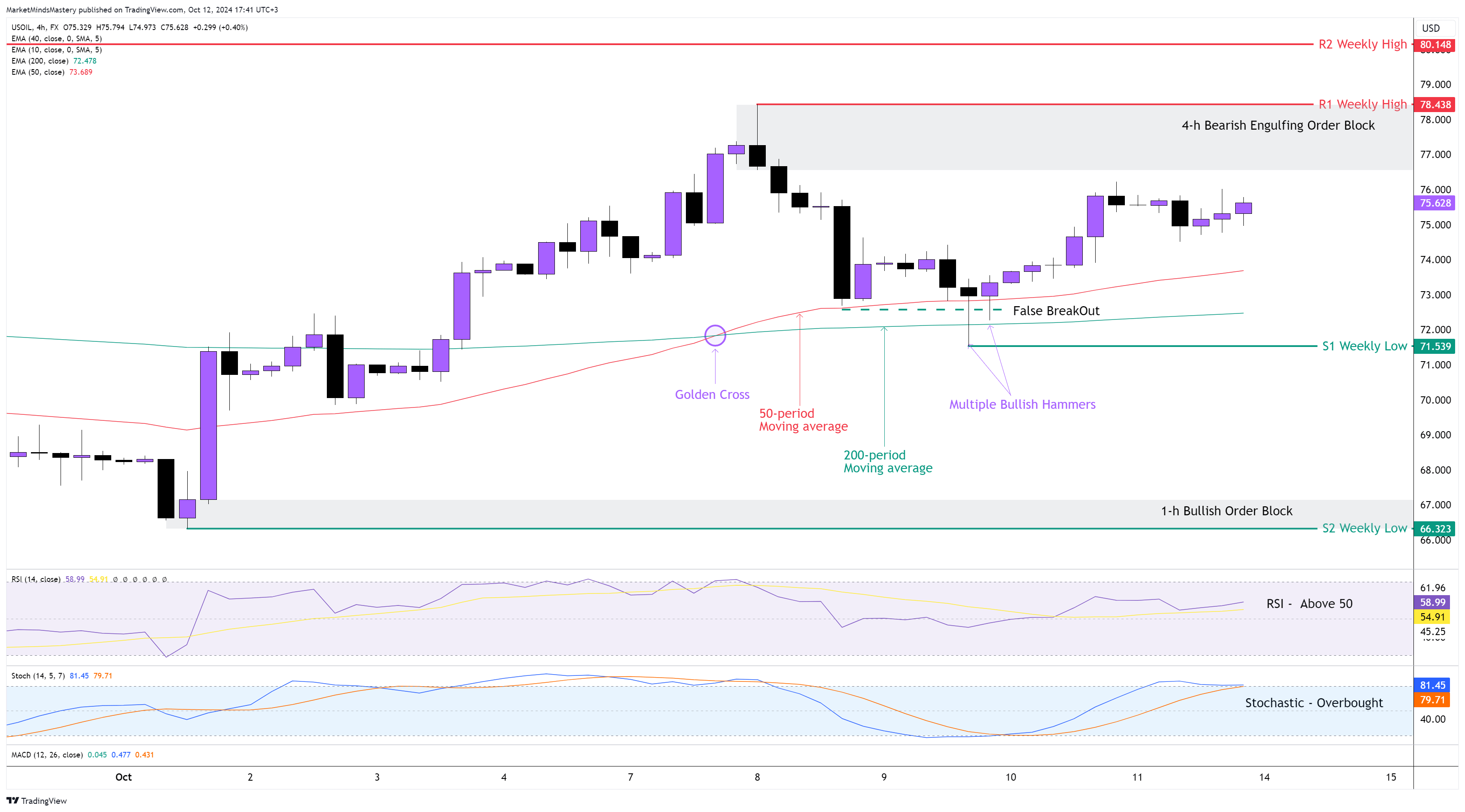 Last Wednesday, the price tested the Bullish Engulfing Order Block at around $71, as we pointed out on the chart, bounced off and moved upwards. The price on the weekly chart ended as a Spinning Top around weekly resistance and also rejected the 40-period weekly moving average (not shown on the chart). On the 4-hour chart, the 50-period moving average crossed above the 200-period known as the Golden Cross. The RSI is above 50, indicating bullishness. The Stochastic Oscillator is at its overbought condition, which is bullish. Currently, the price is above the 50-period moving average, and this is also bullish. Hence, starting Monday, if the price continues moving upward, the first resistance area, R1, will be around $78.43. At this price level last Tuesday, the price created a Bearish Engulfing Order Block, which can provide additional resistance for the price. If the price penetrates the R1 and keeps increasing, the next resistance area, R2, will be at $80.14, an old weekly level.