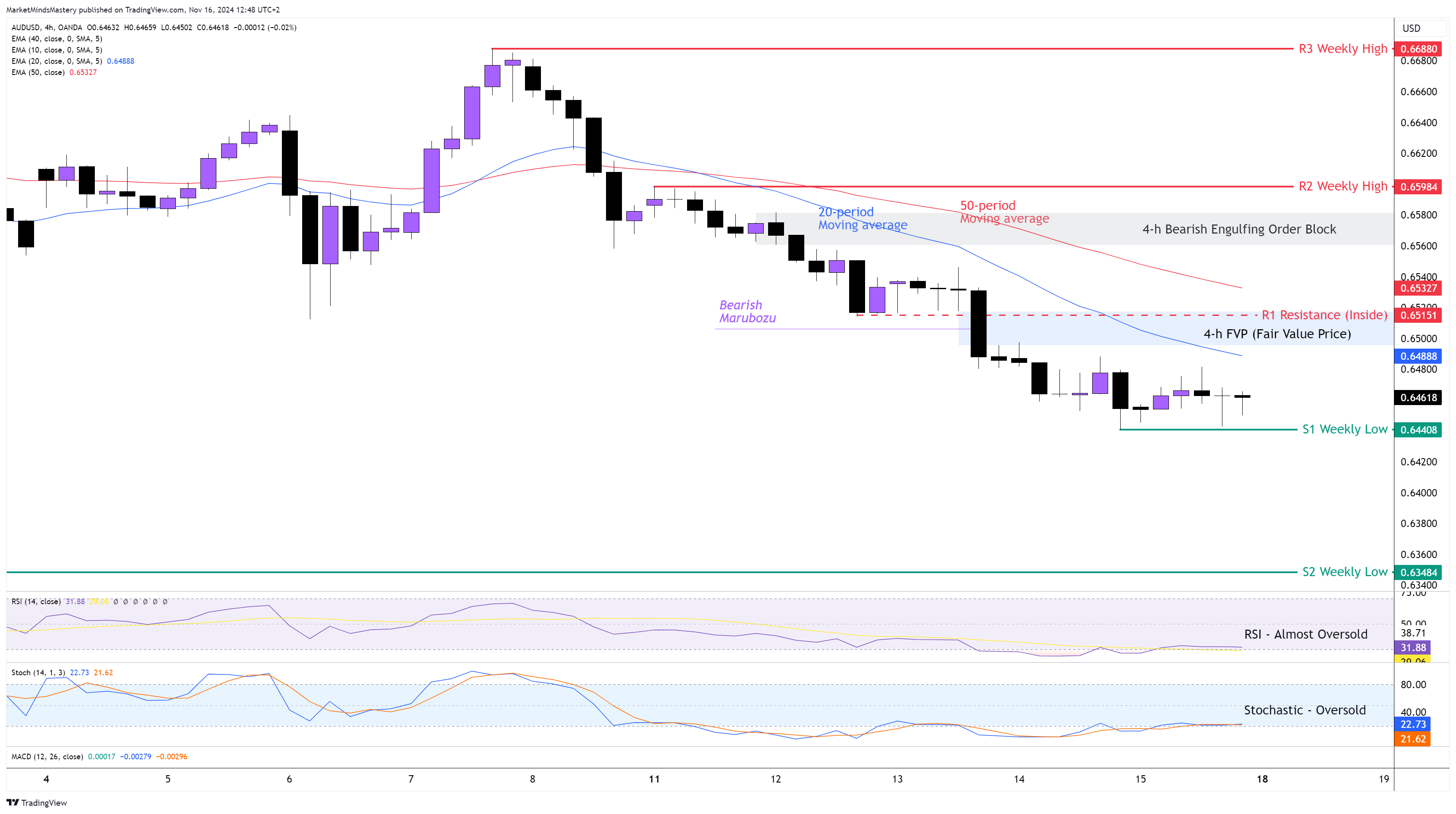 De igual forma, el Oscilador Estocástico está casi en su condición de sobreventa, lo que tiene implicaciones bajistas. A partir del lunes, si el precio sigue moviéndose a la baja, la primera zona de soporte, S1, estará alrededor de 0,64408, que es el mínimo de la semana anterior. Si el precio penetra el S1 y sigue moviéndose a la baja, la siguiente zona de soporte, S2, estará en 0,63484, que es un nivel semanal más antiguo. Por otro lado, si el precio rebota y se mueve al alza, la primera zona de resistencia, R1, será una resistencia interior en torno a 0,65151. Se considera una zona importante porque coexiste con el FVP de 4 h y la media móvil de 20 periodos. Si el precio penetra la R1 y sigue moviéndose al alza, la siguiente resistencia, la R2, estará en 0,65984, que es el máximo de la semana anterior.