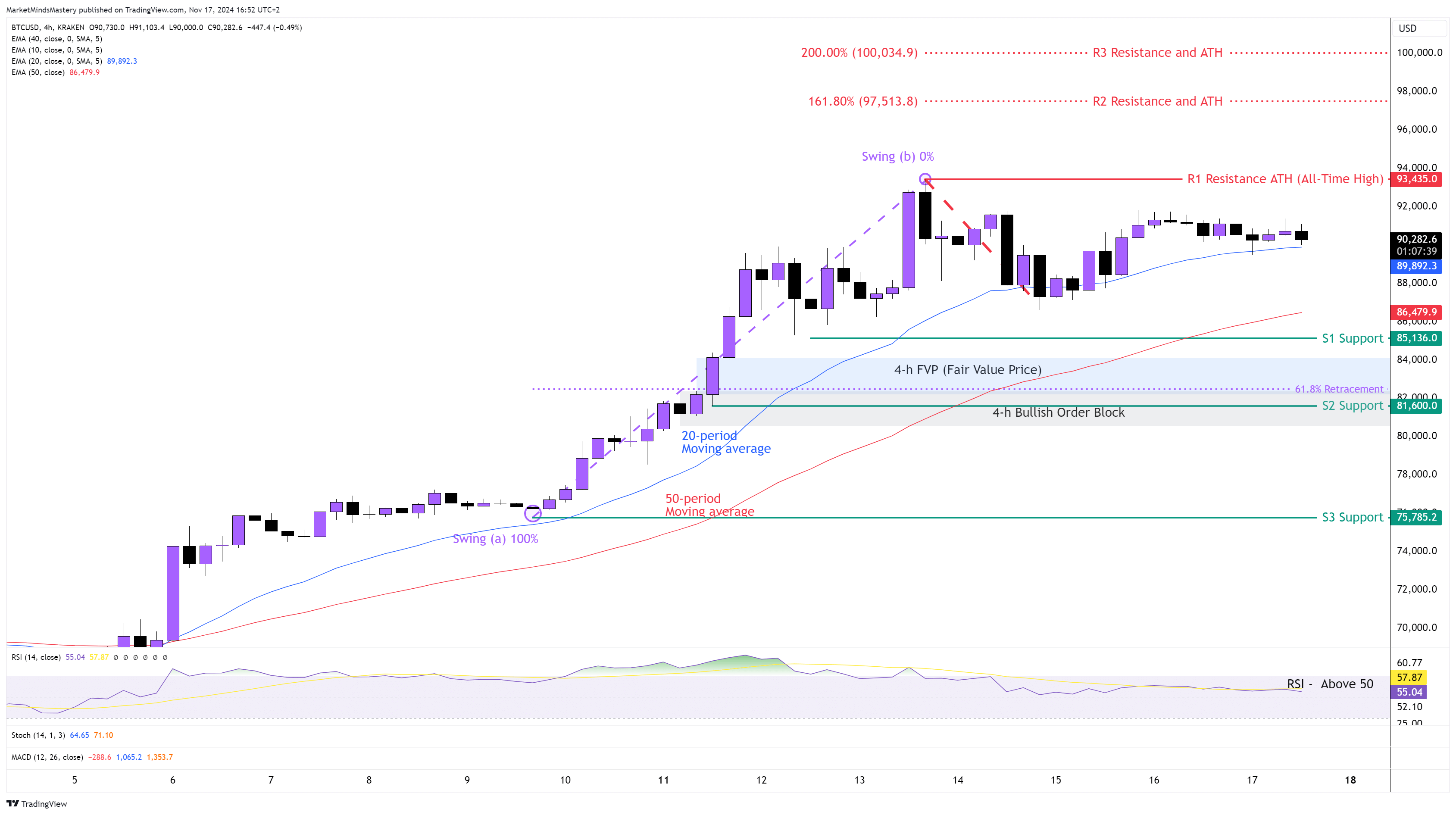 Por otro lado, si el precio es rechazado e inicia una fase de retroceso, comenzará a moverse a la baja, y la primera zona de soporte, S1, estará en torno a 85136 $. Si el precio penetra el S1 y sigue bajando, la siguiente zona de soporte, S2, estará en 81600 $. Esto se considera un nivel clave de soporte ya que consiste en un Bullish Engulfing Order Block, un FVP (Fair Value Price) y el 61.8% Fibonacci Golden Ratio