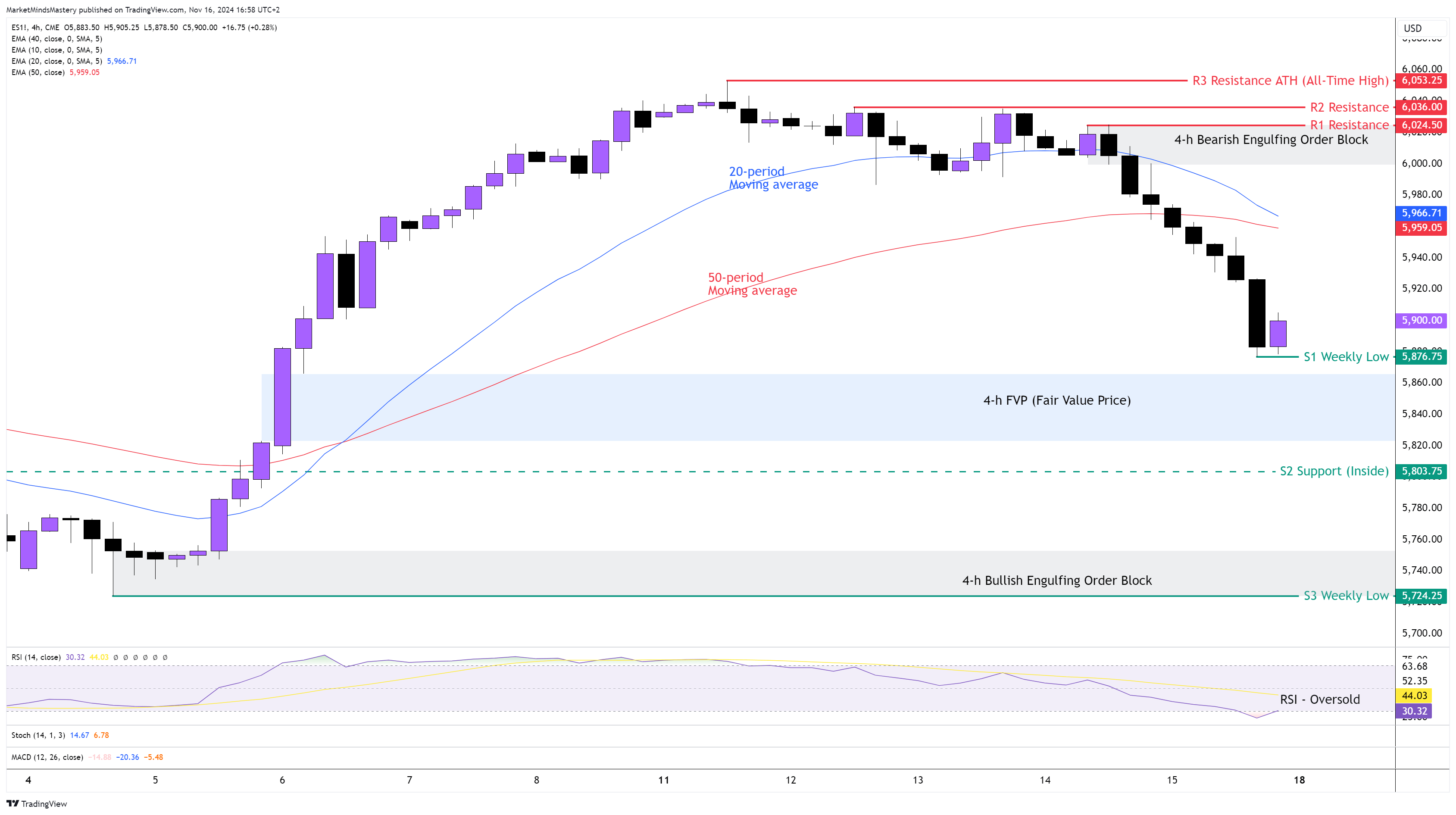 Por otro lado, si el precio se mueve al alza, la primera zona de resistencia, R1, será $6024.50. Un Bearish Engulfing Order Block fue creado la semana pasada en este nivel, y aún no ha sido probado. Si el precio penetra el R1 y sigue subiendo, la siguiente zona de resistencia, R2, será $6036.