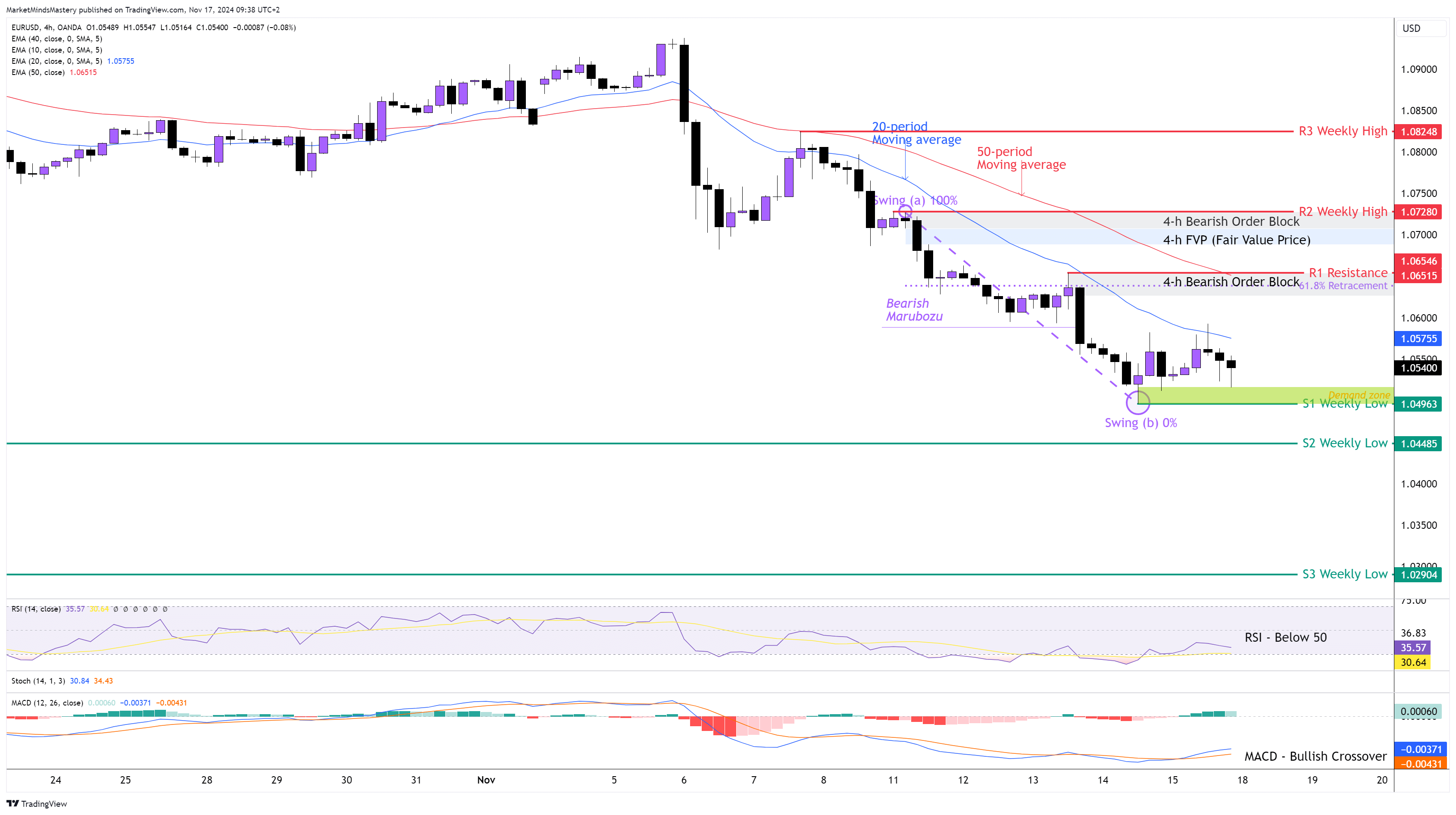 Por otro lado, si el precio se mueve al alza, la primera zona de resistencia, R1, estará en torno a 1,06546. Se trata de un nivel de resistencia clave, ya que está formado por el 61,8% Golden Ratio del nivel Fibonacci que mide desde el giro en el punto (a) hasta el giro en el punto (b), el Bearish Order Block y la media móvil de 50 periodos. Si el precio penetra la R1 y sigue subiendo, la siguiente zona de resistencia, la R2, estará en torno a 1,07280, que es el máximo de la semana anterior.