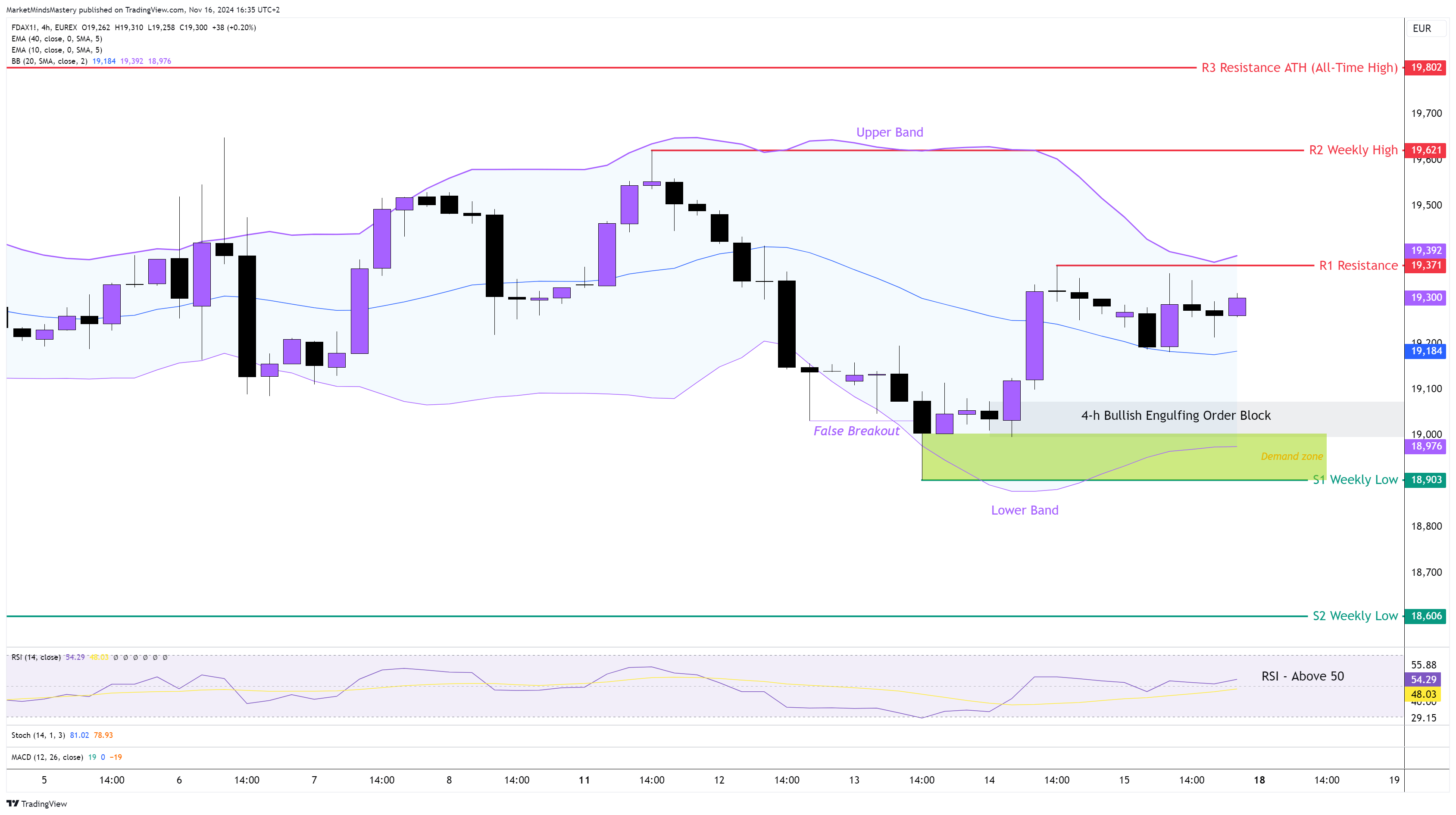 El movimiento lateral comenzó hace unas semanas y continuó la semana pasada, forzando a la vela semanal a terminar como una vela Doji de piernas largas y rechazando la media móvil semanal de 10 periodos (no se muestra en el gráfico). En el gráfico de 4 horas, el precio creó una Falsa ruptura a la baja el pasado miércoles. Al día siguiente, un Bullish Engulfing patrón de velas creó un Bullish Engulfing Order Block alrededor de 19.000. Desde entonces, el precio se ha movido al alza, y el viernes pasado, el precio cerró por encima de la media móvil de 20 periodos, que es el medio de las bandas de Bollinger. El RSI está por encima de su línea media de 50, y esto tiene implicaciones alcistas. Por lo tanto, si el precio se mueve al alza, la primera zona de resistencia, R1, estará en 19,371. Si el precio penetra la R1 y sigue subiendo, la siguiente zona de resistencia, R2, estará en 19,621, que es el máximo de la semana anterior. Este nivel de precios coexiste con la banda superior del indicador de bandas de Bollinger. Si el precio es rechazado y se mueve a la baja, la primera zona de soporte, S1, será 18,903, que es el mínimo de la semana anterior. Si sigue bajando, encontrará la siguiente zona de soporte, S2, en 18,606.