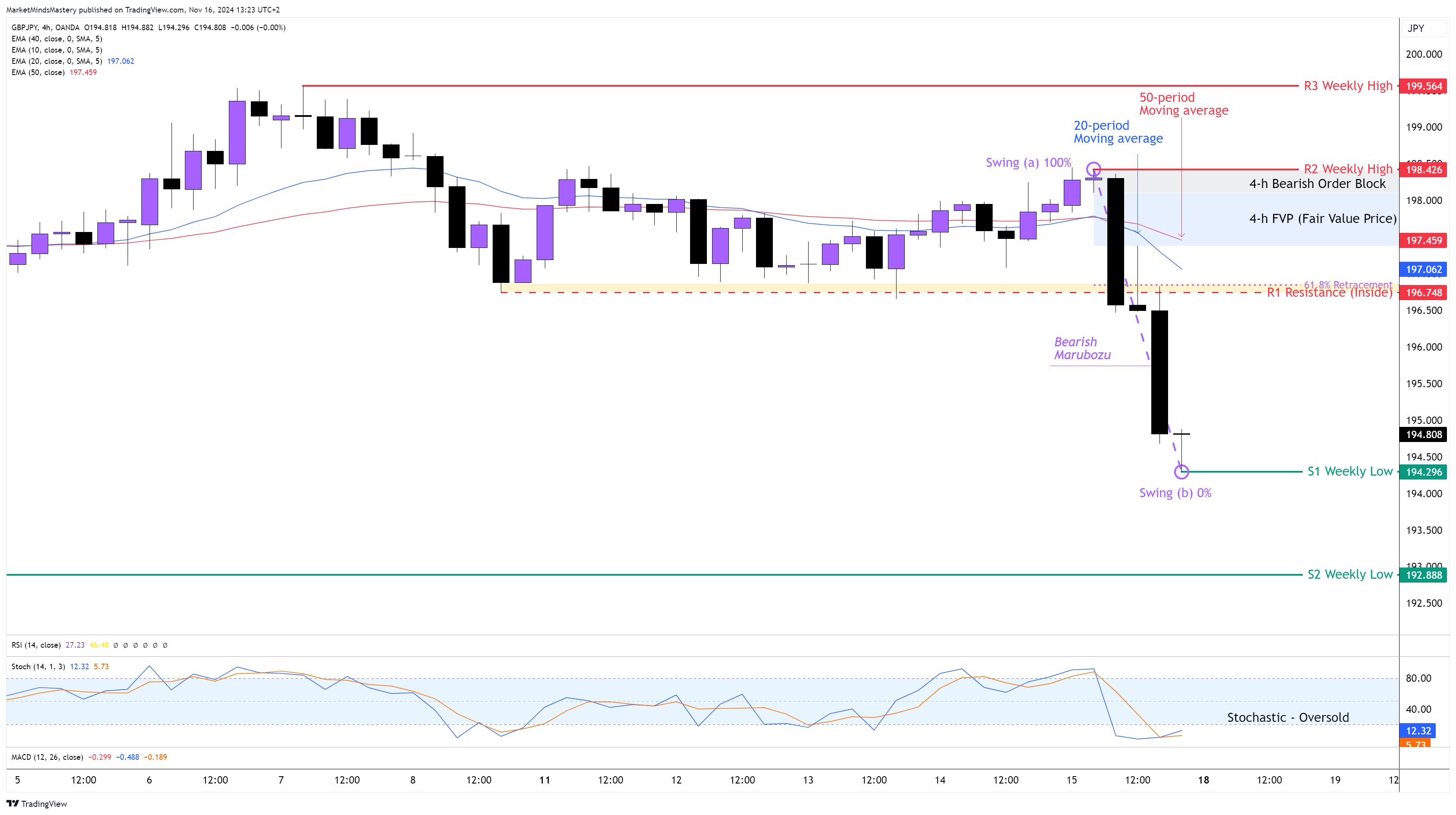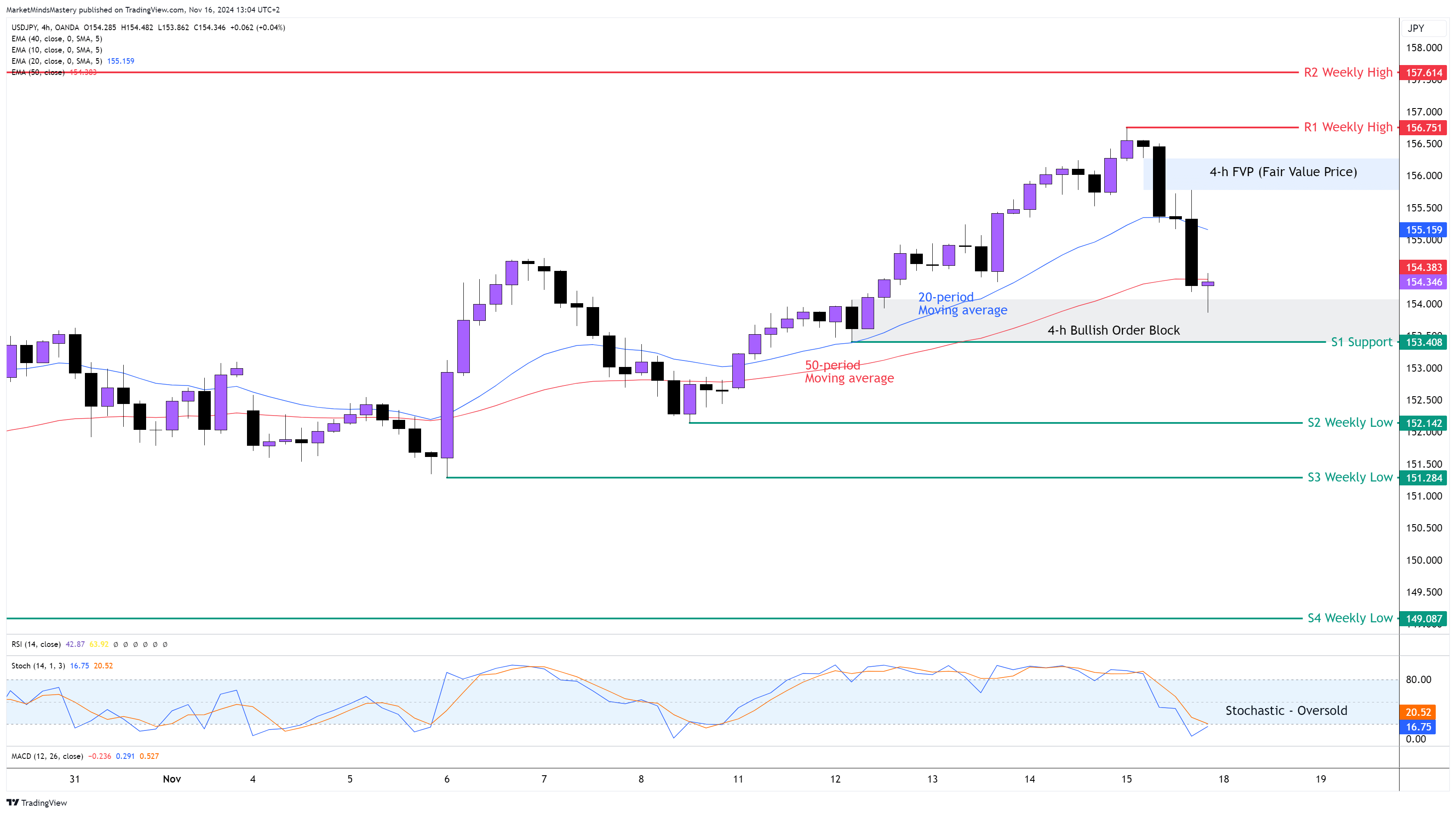 A pesar de la fortaleza del dólar estadounidense la semana pasada, el yen japonés fue la siguiente divisa más fuerte. Por lo tanto, el precio en el gráfico semanal terminó como una vela alcista pero con una mecha superior notable, lo que puede causar algún retroceso esta semana. En el gráfico de 4 horas, el periodo 20 está por encima de la media móvil de periodo 50, y esto es alcista. El precio estuvo haciendo máximos y mínimos más altos hasta el viernes pasado. El martes pasado, el precio creó un bloque de órdenes alcista de alrededor de 154.000. Por último, el viernes, mientras el precio bajaba, se creó un FVP (Fair Value Price) en torno a 156,000, que aún no ha sido testeado. El Oscilador Estocástico se encuentra en una condición de Sobreventa, y esto es bajista. El viernes pasado, el precio entró en la zona de Bloqueo de órdenes, y también cerró por debajo de la media móvil de 50 periodos, como se muestra en el gráfico.