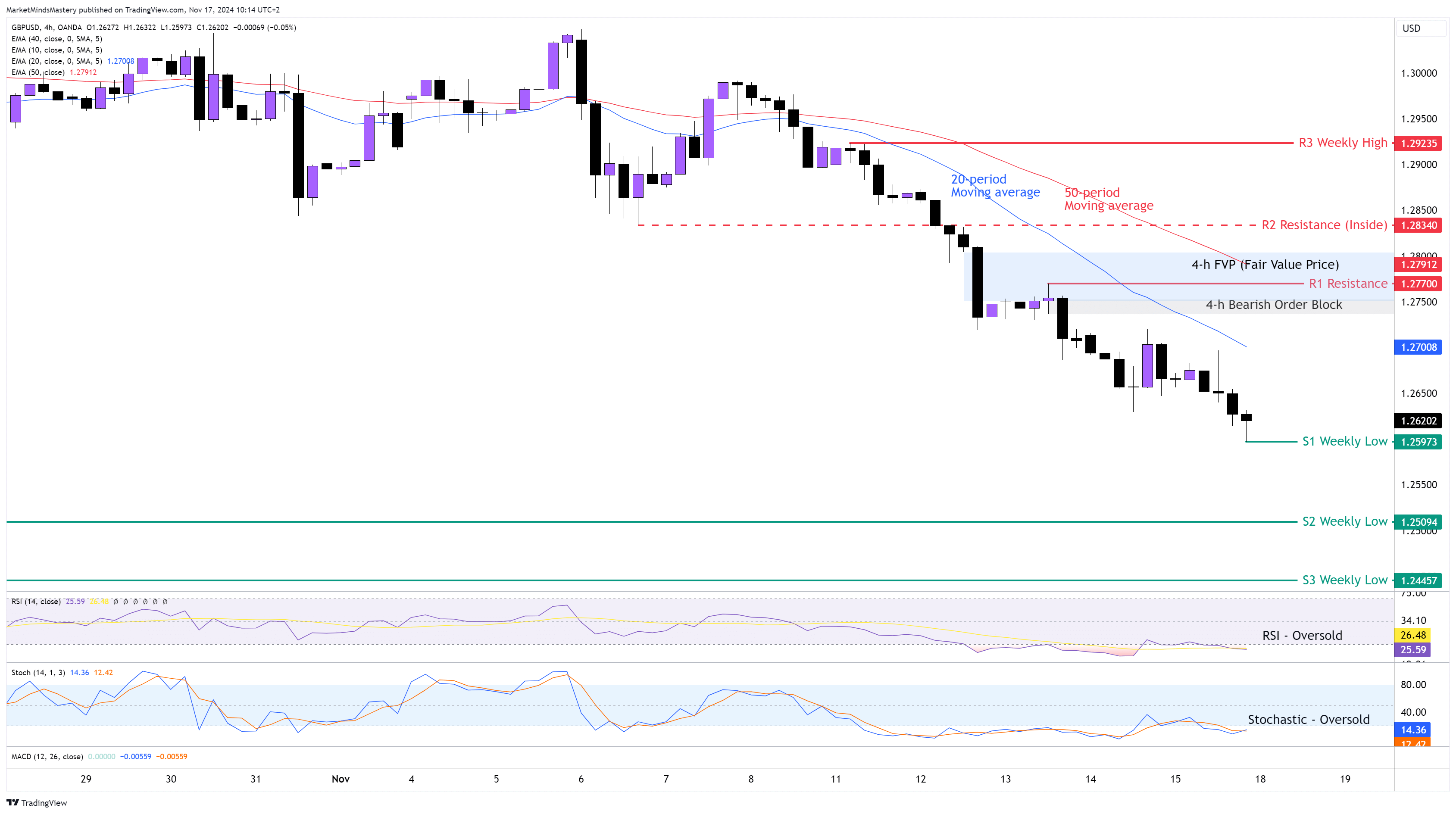 Siguiendo el Market Outlook de la semana anterior, el movimiento lateral terminó como una ruptura bajista. En el gráfico semanal, la acción del precio terminó como una continuación bajista. En el gráfico de 4 horas, el precio creó una serie de máximos y mínimos más bajos. El martes pasado, durante la sesión de Nueva York, el precio creó un FVP (Fair Value Price) alrededor de 1,28000. El precio se consolidó durante un tiempo, y al día siguiente, continuó con una nueva formación de mínimos más bajos, creando un Bloque de Orden Bajista alrededor de 1,27500. Según el análisis de medias móviles, la de 20 periodos está por debajo de la de 50 periodos, y esto es bajista. Tanto el RSI como el Oscilador Estocástico se encuentran en su condición de sobreventa, y esto también tiene implicaciones bajistas. Por lo tanto, si el precio continúa moviéndose hacia abajo, la primera zona de soporte, S1, estará alrededor de 1,25973, que es el mínimo de la semana anterior. Si el precio penetra el S1 y sigue bajando, la siguiente zona de soporte, S2, estará en torno a 1,25094.