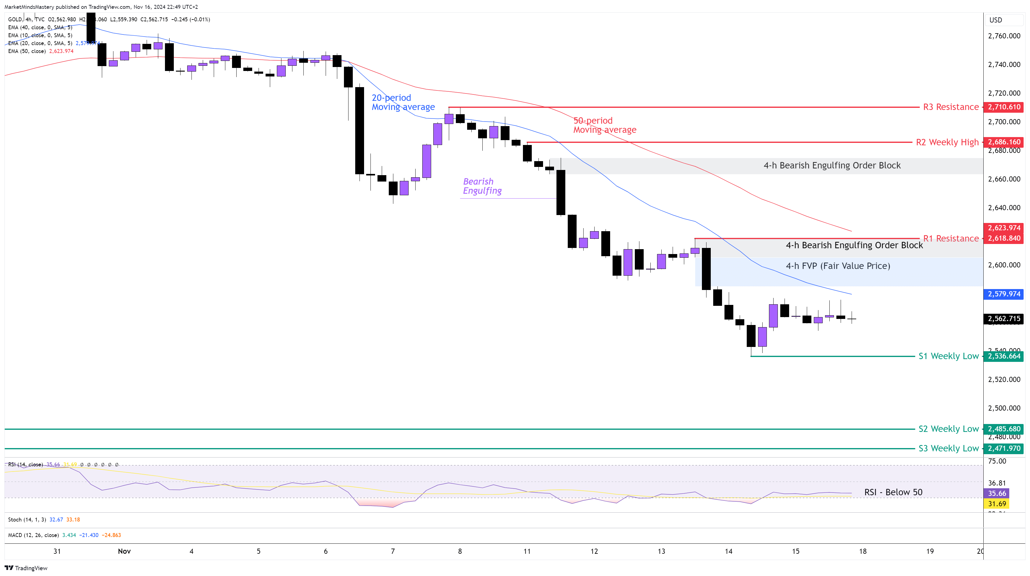 El precio del ORO descendió una semana más en crudo. La tendencia primaria semanal es alcista. Sin embargo, en marcos de tiempo más bajos, como el del gráfico de 4 horas, el precio creó una fuerte tendencia bajista con una serie de máximos más bajos y mínimos más bajos. El lunes y el miércoles, el precio creó dos Bearish Engulfing Order Blocks alrededor de $2670 y $2610, respectivamente. Además, la fuerte venta del precio el miércoles, durante la sesión de Nueva York, creó un FVP (Precio de Valor Justo) de alrededor de 2600$. El período de 20 está por debajo de la media móvil de 50 períodos, y esto es bajista. El Oscilador RSI está por debajo de su línea media de 50, lo que también tiene implicaciones bajistas. Actualmente, el precio se encuentra por debajo de la media móvil de 20 periodos. Si el precio continúa moviéndose a la baja, la primera zona de soporte, S1, estará en $2536, que es el mínimo de la semana anterior. Si el precio penetra la S1 y sigue bajando, la siguiente zona de soporte, la S2, estará en los 2485$. Por el contrario, si el precio se mueve hacia arriba, la primera zona de resistencia, R1, estará en 2623$. Se considera un nivel de resistencia importante porque está formado por el bloque de orden envolvente bajista de 4 horas formado el miércoles pasado en torno a los 2600 $ y la media móvil de 50 periodos. Si el precio penetra la R1 y sigue subiendo, la siguiente zona de resistencia, la R2, será aproximadamente 2686$, que es el máximo de la semana anterior.