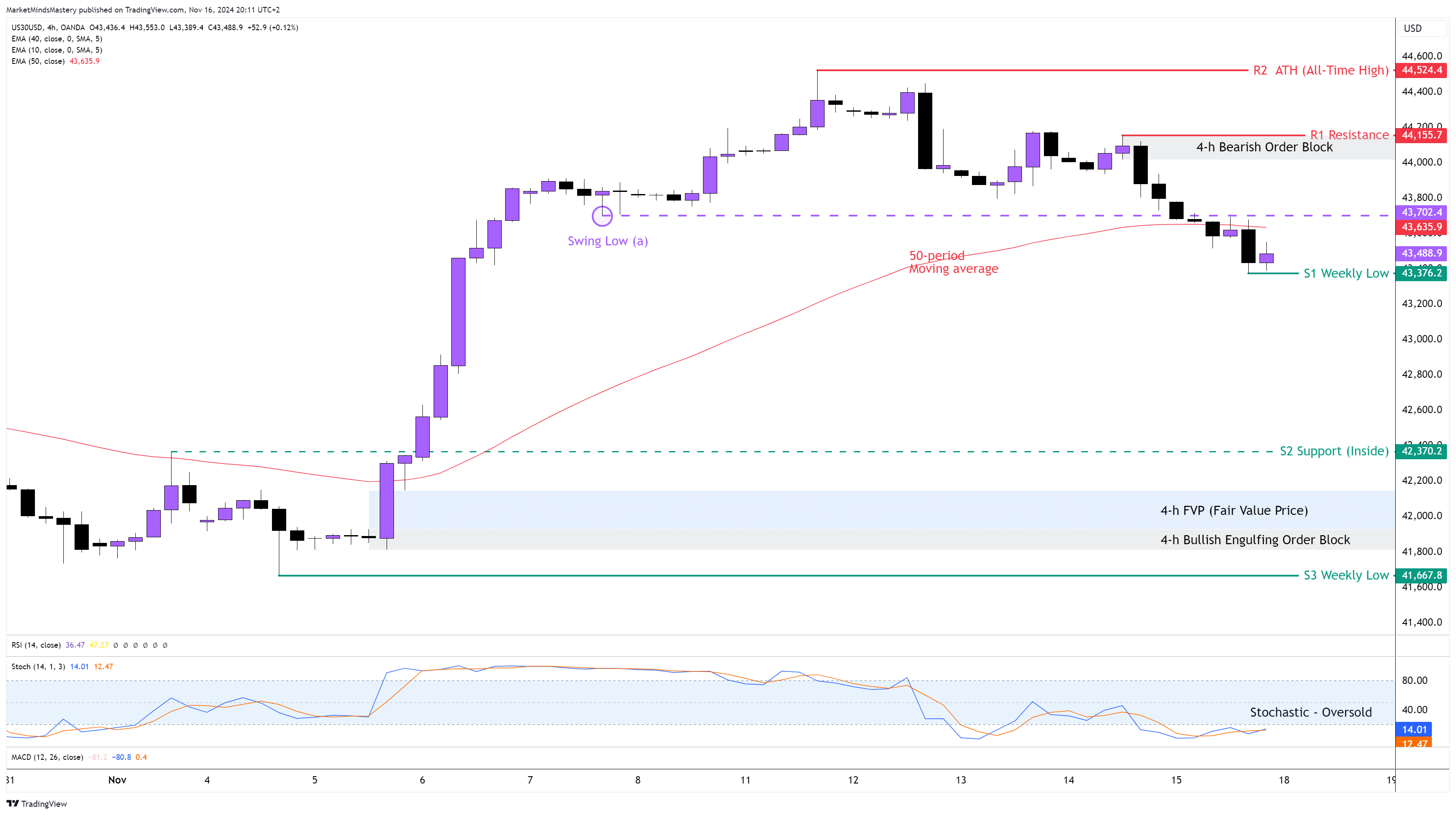 Siguiendo las Perspectivas de Mercado de la semana anterior, el precio del US30 se movió hacia arriba, probando la Extensión de Fibonacci del 300% alrededor de $44524, lo que creó un nuevo ATH (All-Time High). Desde entonces, ha comenzado a moverse a la baja con grandes velas bajistas, como se muestra en el gráfico. El viernes pasado, el precio penetró el mínimo de oscilación en el punto (a), que fue el origen del último movimiento alcista, lo que significa que la tendencia alcista ya no es válida. Al final de la sesión de Nueva York, el precio cerró por debajo de la media móvil de 50 periodos, lo que tiene implicaciones bajistas. Esto también provocó que el Oscilador Estocástico se convirtiera en Oversold, indicando la agresiva presión vendedora del mercado US30 por parte de las órdenes de venta. Si el precio continúa moviéndose a la baja, la primera zona de soporte, S1, estará en $43376, que es el mínimo de la semana anterior. Si el precio penetra el S1 y continúa moviéndose a la baja, la siguiente zona de soporte, S2, será un soporte interno en $42370, que se creó hace unas semanas. Por el contrario, si el precio rebota y se mueve hacia arriba, la primera zona de resistencia, R1, estará en $44155. Esta se considera una zona de resistencia importante, ya que coexiste con la orden envolvente bajista de 4 h bloque creada el pasado jueves, que provocó la ruptura del precio y el cambio de dirección de la tendencia, tal y como se muestra en el gráfico. Si el precio penetra el R1 y sigue subiendo, la siguiente zona de resistencia, R2, será el ATH (All-Time High) en 44524$.