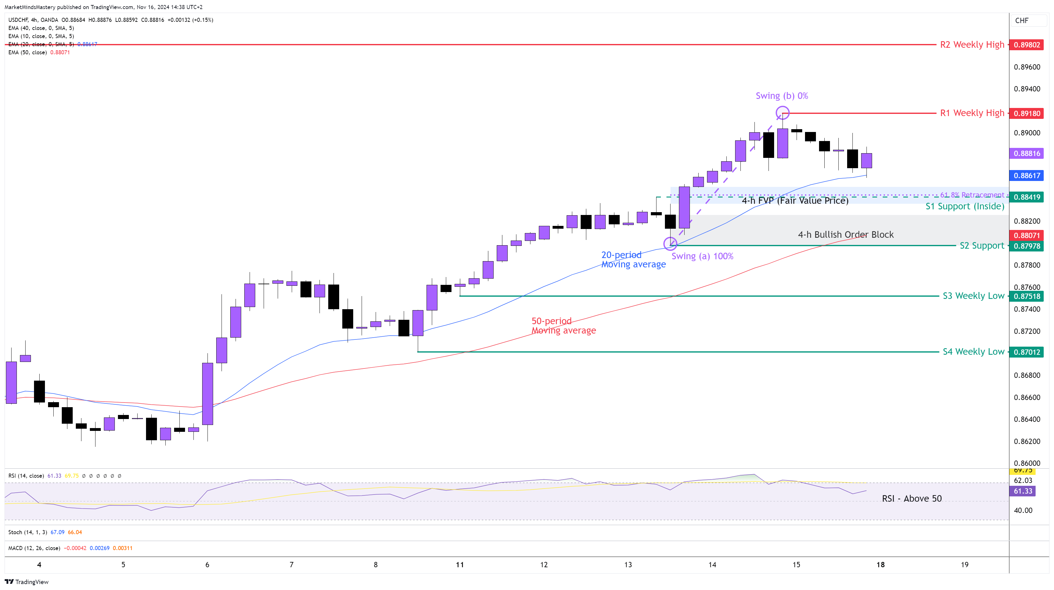 La acción del precio semanal envolvente alcista de la semana anterior jugó bien y envió el precio del par de divisas USDCHF más alto en valor, creando un patrón de velas de continuación alcista en el gráfico semanal. En el gráfico de 4 horas, el precio continuó, haciendo máximos más altos y mínimos más altos. El pasado miércoles, tras la publicación del IPC en EEUU, el precio creó un Bloque de Orden Alcista en torno a 0,88000, y al mismo tiempo, un FVP (Precio de Valor Justo) en torno a 0,88400. El 20 periodos está por encima de la media móvil de 50 periodos, y esto es alcista. El Oscilador RSI está por encima de la línea media de 50, y esto tiene implicaciones alcistas. A partir del lunes, si el precio sigue subiendo, la primera zona de resistencia, R1, estará en 0,89180, que es el máximo de la semana anterior. Si el precio penetra la R1 y sigue subiendo, la siguiente zona de resistencia, R2, estará en torno a 0,89802.