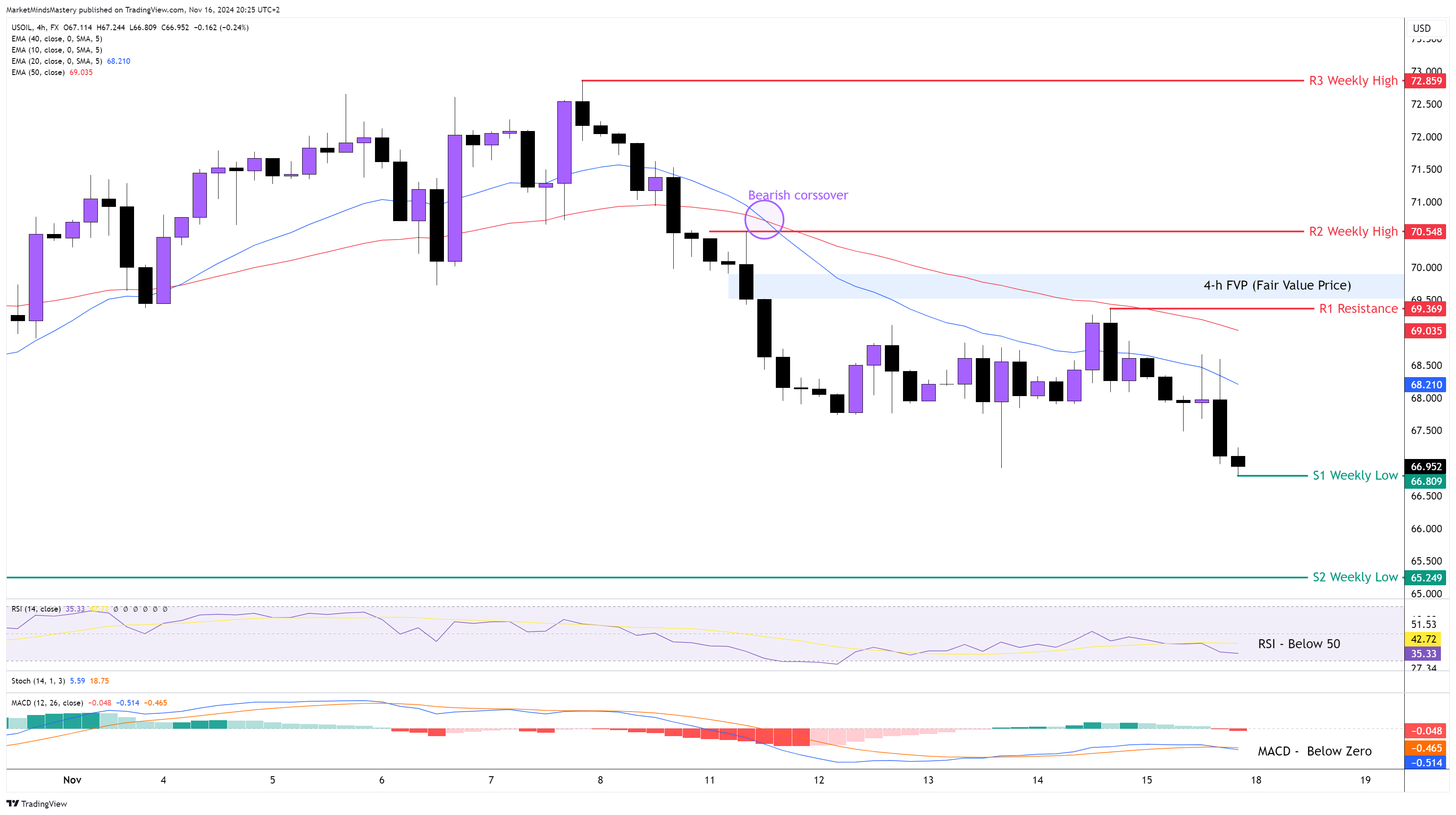La forma en que la acción del precio semanal se movió la semana pasada en el mercado USOIL podría describirse como un ejemplo de "libro de texto". La tendencia primaria es bajista, y la acción del precio de reversión llevó a una continuación bajista con una vela Marubozu bajista. En el gráfico de 4 horas, el periodo 20 cruzó por debajo del periodo 50, conocido como crossover bajista. El RSI está por debajo de su línea media de 50, y esto es bajista. Del mismo modo, el MACD se encuentra por debajo de la línea cero, lo que tiene implicaciones bajistas. Actualmente, el precio ha rechazado la media móvil de 20 periodos, creando una formación de máximo inferior y mínimo inferior. Por lo tanto, si el precio continúa moviéndose hacia abajo, la primera zona de soporte, S1, estará alrededor de 66,80 dólares, que es el mínimo de la semana anterior. Si el precio penetra el S1 y sigue moviéndose a la baja, la siguiente zona de soporte, S2, será de aproximadamente 65,24 $. En caso de que el precio rebote y se mueva al alza, la primera zona de resistencia, R1, se situará en torno a los 69,36$. Si el precio penetra el R1 y sigue subiendo, existe un FVP (Fair Value Price) que se creó el pasado lunes en torno a los 69,60$, y puede actuar como zona de resistencia. Si el precio supera el FVP y sigue subiendo, la siguiente zona de resistencia, el R2, estará aproximadamente en los 70,54$, que es el máximo de la semana anterior.