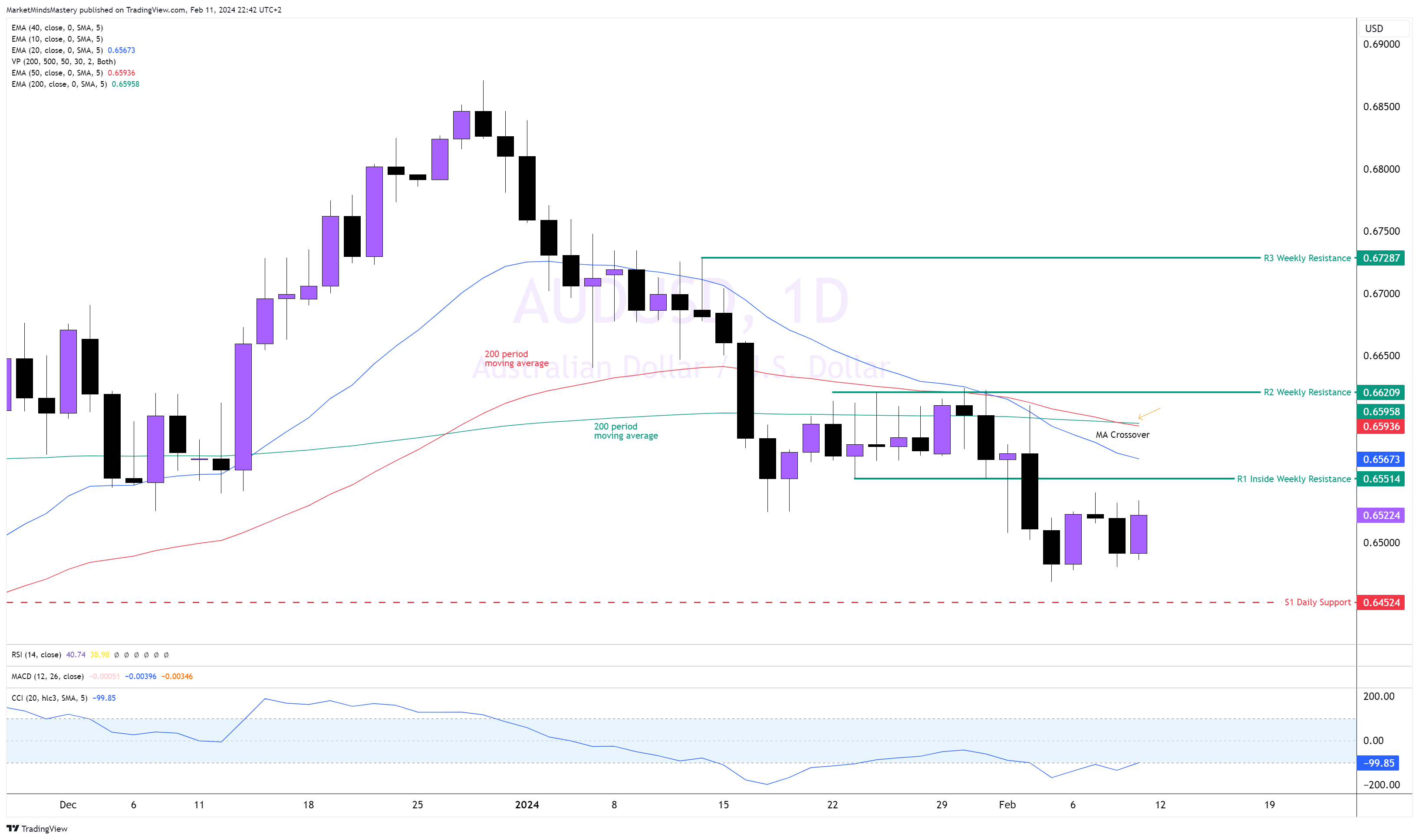 Tras la caída iniciada a principios de enero, la cotización registró máximos y mínimos más bajos. La media móvil de 50 periodos cruzó por debajo de la media móvil de 200 periodos, una indicación bajista. El MACD cotiza por debajo de la línea cero, también bajista. Si el precio se mueve al alza, la primera zona de resistencia, R1, es una resistencia semanal interna, aproximadamente 0,65514. La siguiente resistencia dinámica se convierte en la media móvil si el precio penetra la R1 y cierra por encima de ella. Normalmente, cuando los mercados están en tendencia, las medias móviles actúan como zonas de resistencia. Por el contrario, si el precio desciende y se mueve a la baja, la primera zona de soporte, S1, se encuentra en torno al nivel de 0,64524. Una ruptura por debajo de ella puede encontrar el soporte, S2, aproximadamente en 0,63473.