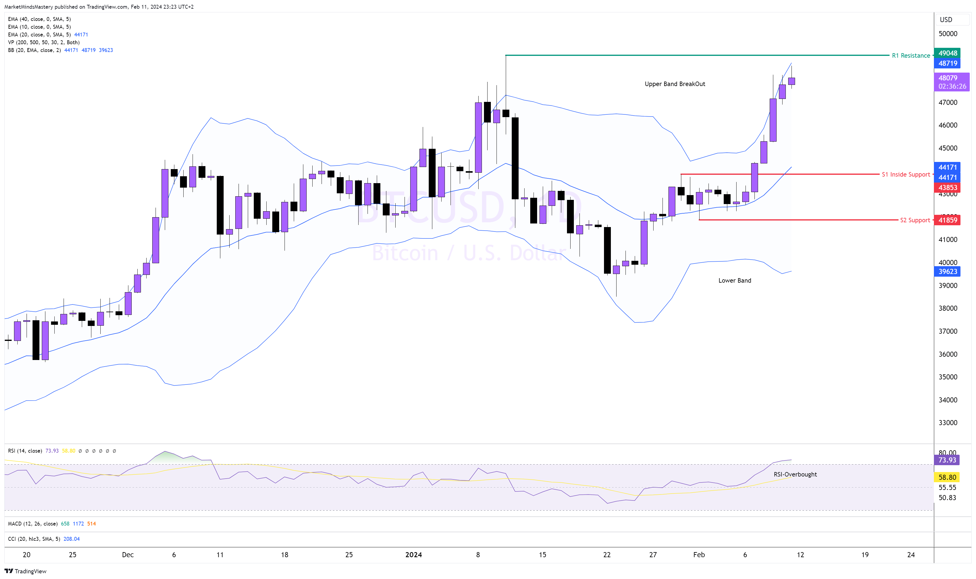 Tras el movimiento lateral, el precio cotizó entre 42.000 y 43.500 dólares. Desde la semana pasada, el precio se ha movido al alza y actualmente se encuentra muy cerca de los 49.000 $. El precio está "caminando por la banda superior", lo que demuestra que los compradores controlan el mercado. El oscilador RSI está sobrecomprado, lo que indica una tendencia alcista. Si el precio sigue subiendo, la primera resistencia, R1, se sitúa en torno a los 49.000 $. Una ruptura y un cierre por encima de la misma puede impulsar el precio a la siguiente zona de resistencia, R2, aproximadamente 52.000 $. En caso de que el precio baje y se mueva a la baja, el primer soporte interno, S1, se encuentra en 43.850 $. Si el precio sigue bajando, la siguiente zona de soporte, S2, se encuentra aproximadamente en 41.850 $.