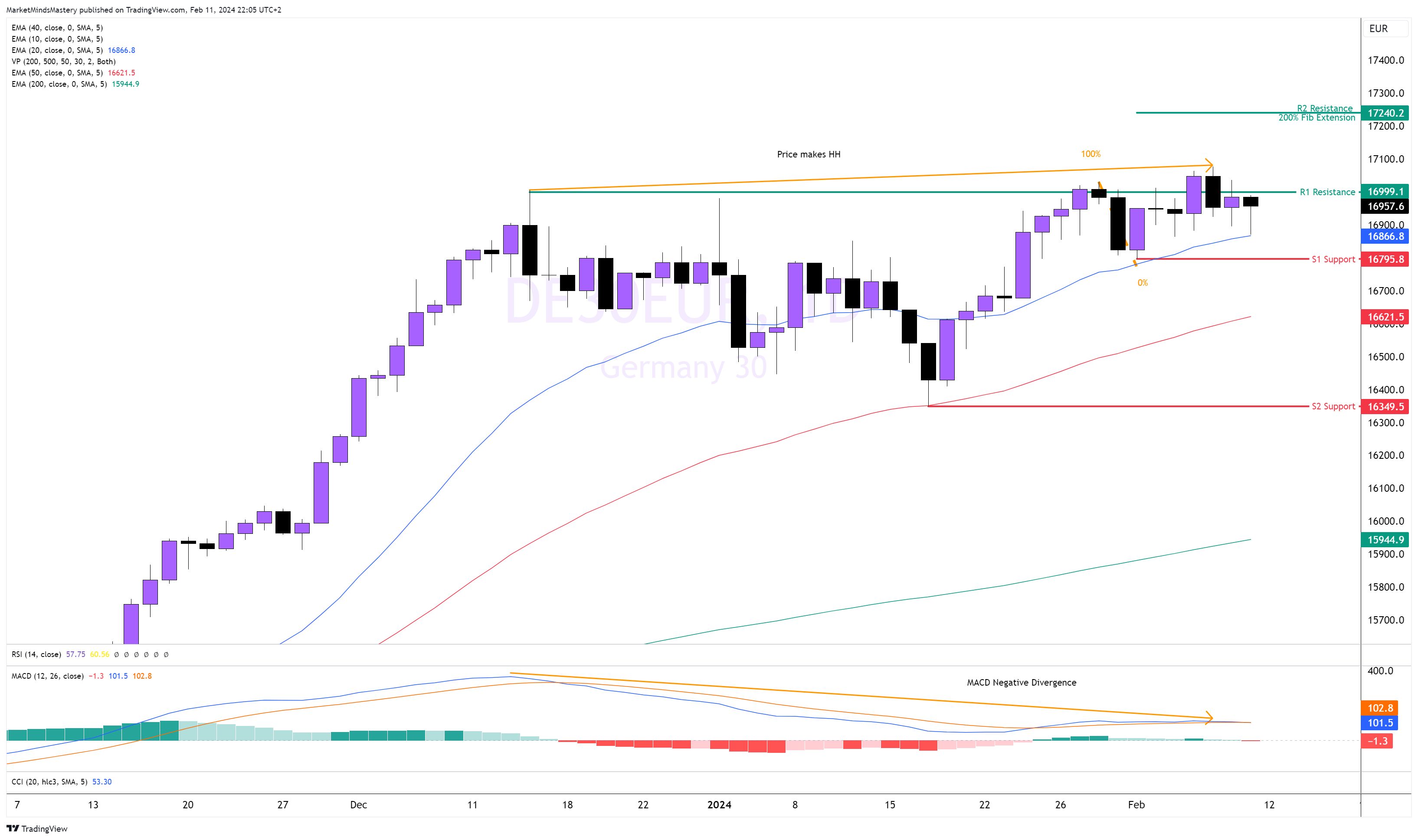 El precio del Indicie alemán está subiendo con una serie de máximos y mínimos más altos. En general, se trata de un mercado alcista. El MACD imprimió divergencias bajistas o negativas en este último máximo reciente, lo que indica que el precio sigue subiendo con menos impulso que el movimiento alcista impulsivo anterior. Esto puede situar al precio en una corrección a corto plazo. Sin embargo, el precio sigue en una tendencia alcista. También se mantiene por encima de la media móvil de 20 periodos, que es alcista, y la estructura del mercado no se ha roto. Por lo tanto, si el precio sigue subiendo, la próxima zona de resistencia se puede estimar utilizando la extensión de Fibonacci del 200%, ya que el precio se encuentra en su máximo histórico, sin tener ninguna referencia del pasado reciente. Por el contrario, si el precio desciende y se mueve a la baja, la primera zona de soporte, S1, se fundó en torno a 16795. Si el precio penetra el S1 y se mueve a la baja, el siguiente soporte, S2, puede ser el 16349.