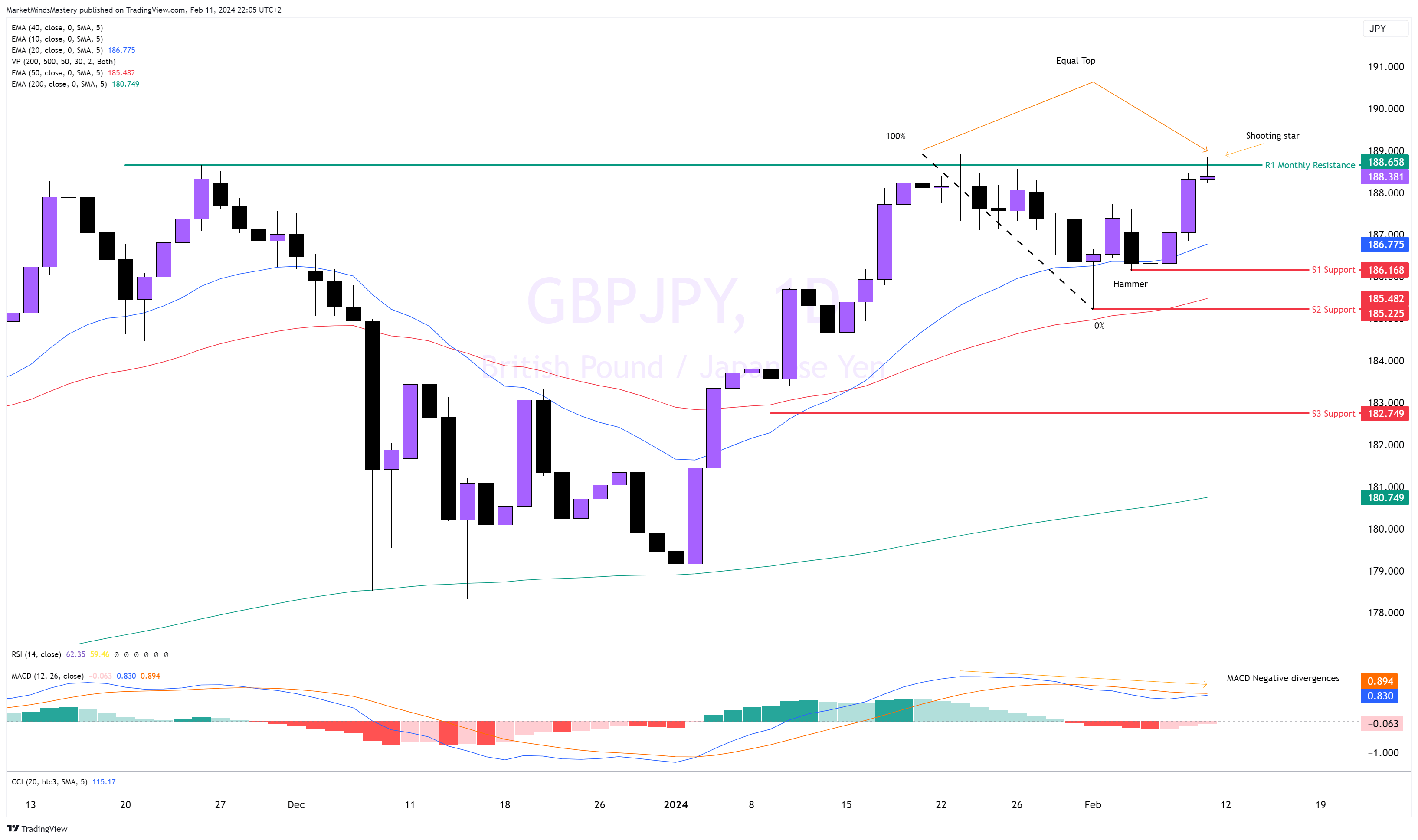 Además, el precio formó máximos iguales. Los operadores deben entender, en este punto, que la formación de un equal top no es un double top todavía. Un doble techo es una formación de precio confirmada después de la penetración del soporte S2, que, en esta ocasión, el S2, es el neckline del potencial patrón de reversión Doube top. Si el precio desciende y se mueve a la baja, el primer soporte, S1, se encuentra aproximadamente en 186,168. Un nuevo descenso puede llevar al siguiente soporte, S2, en torno a 185,225. La MA de 50 periodos también puede actuar como soporte dinámico en esta zona. Por el contrario, si el precio se mueve al alza y penetra la resistencia R1, estimamos la siguiente resistencia con la extensión de Fibonacci del 200% en torno a 192,555.