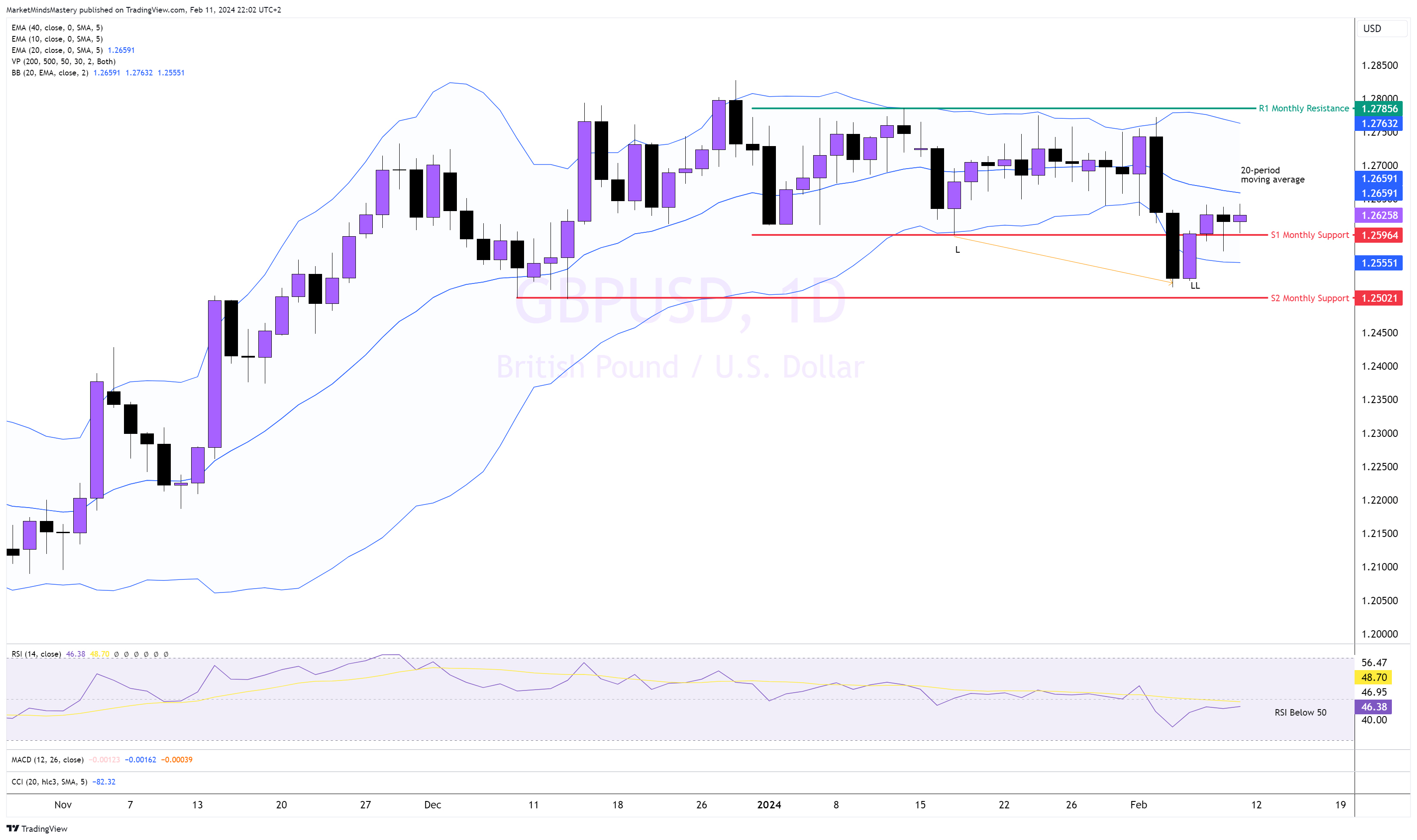Siguiendo el rango creado en los últimos dos meses, el precio rompió fuera del rango a la baja, como explicamos en el análisis de la semana pasada, y creó un mínimo inferior, como se ve en el gráfico anterior. Tras la ruptura, los vendedores no empujaron el precio por debajo de 1,255. Dado que la zona de 1,25 es vital, esperamos una intensa actividad comercial. Por lo tanto, el precio encontró apoyo y se movió al alza. En consecuencia, el precio volvió a situarse dentro de las bandas de Bollinger y siguió cotizando por debajo de la media móvil de 20 periodos. Si el precio sigue subiendo, la media móvil de 20 periodos puede actuar como dinámica, que es una resistencia, y obligar al precio a bajar. Si el precio se mueve por encima de la media móvil de 20 periodos, la primera resistencia estática, R1, será la zona que recientemente albergó una enorme actividad comercial, como se muestra en el gráfico. Se trata de un nivel mensual en torno a 1,2775. Consiste en la banda superior del indicador de bandas de Bollinger. Un retroceso y un movimiento a la baja encuentran el soporte S1 en torno a 1,255 y el soporte S2 en torno a 1,25. El oscilador RSI está por debajo de 50, lo que indica una tendencia bajista.