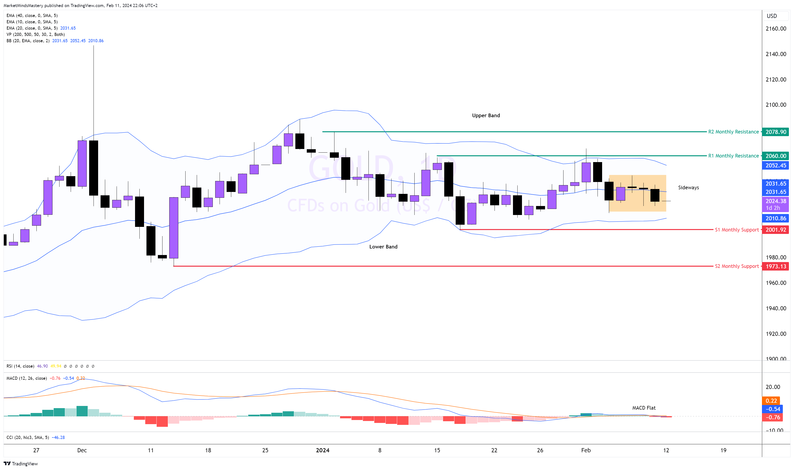 Tras las noticias macroeconómicas de la semana pasada, el oro entró en una fase de consolidación/sin tendencia. El precio sigue rondando la media móvil de 20 periodos de la banda de Bollinger. Las bandas superior e inferior son planas, y el MACD es plano alrededor de la línea cero. Todo esto muestra que el precio es indirecto. Por lo tanto, si el precio baja esta semana, encontraremos el primer soporte, S1, en torno a 2000. Un nivel es un número redondo; los operadores normalmente buscan operar desde este nivel ya que esperan movimientos direccionales. Si el precio rompe por debajo del S1 y se mueve a la baja, la siguiente zona de soporte, S2, se encuentra alrededor de 1973. Por el contrario, si el precio sube, la primera zona de resistencia, R1, se sitúa en torno a 2060. Un cierre por encima de ella y un movimiento al alza puede encontrar la siguiente resistencia, R2, aproximadamente en 2078. Este nivel mensual puede atraer muchos intercambios de órdenes entre compradores y vendedores.