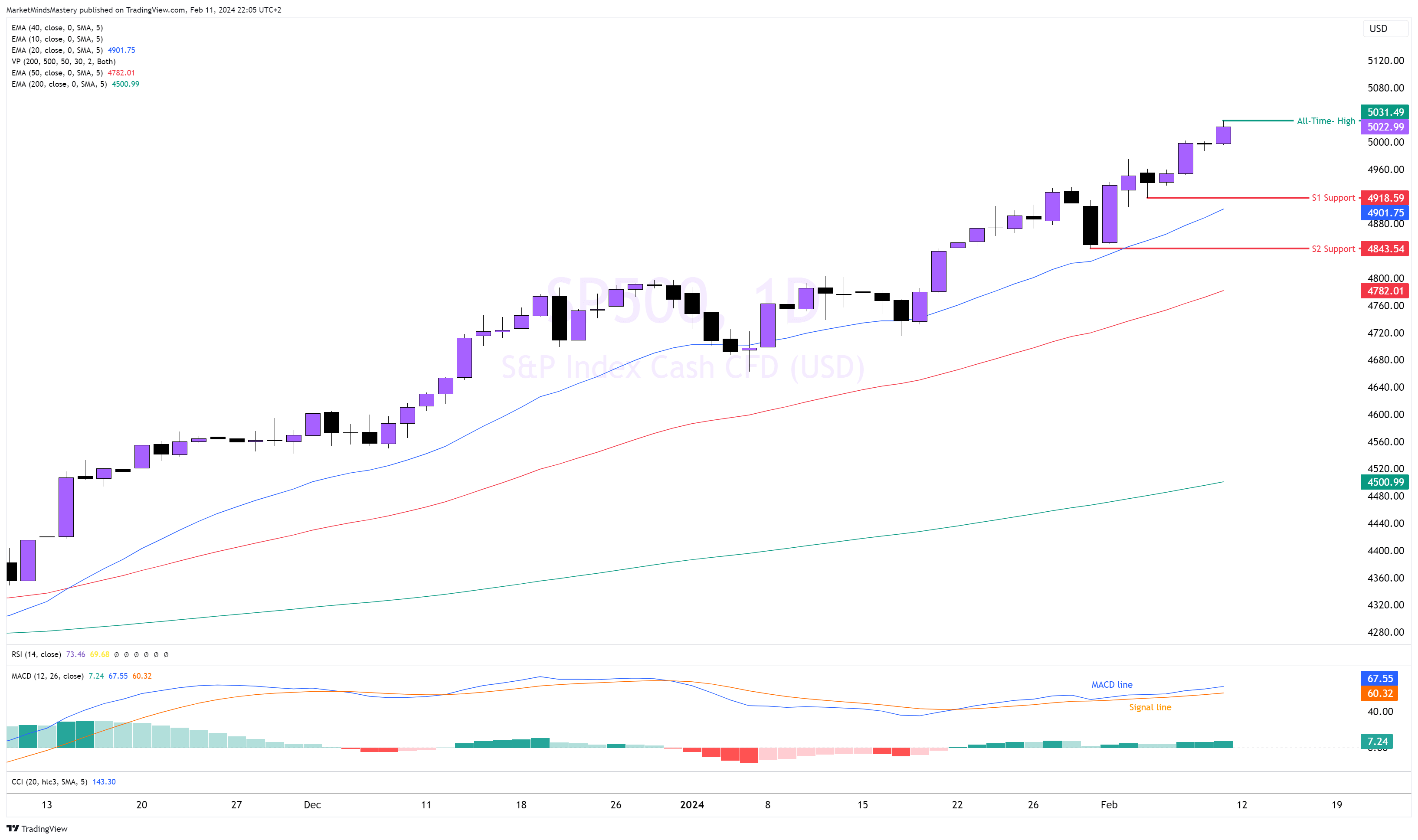 El SP500 marcó un nuevo máximo histórico el pasado viernes, al igual que la semana pasada, y el índice alcanzó la zona de los 5031 puntos. El mercado sigue en una tendencia alcista bien definida y establecida. Las tres medias móviles están en orden, con la de 20 periodos manteniéndose por encima de la de 50 y la de 50 por encima de la de 200. Las tres están bien separadas, y esto es un indicio alcista. La línea MACD (color azul) está por encima de la línea de señal (color naranja), y ambas están por encima de la línea cero, lo que también es alcista. La acción del precio en el gráfico imprime velas alcistas largas, lo que indica que los compradores dominan principalmente este mercado. Los retrocesos son poco profundos y de corta duración, según las velas negras.