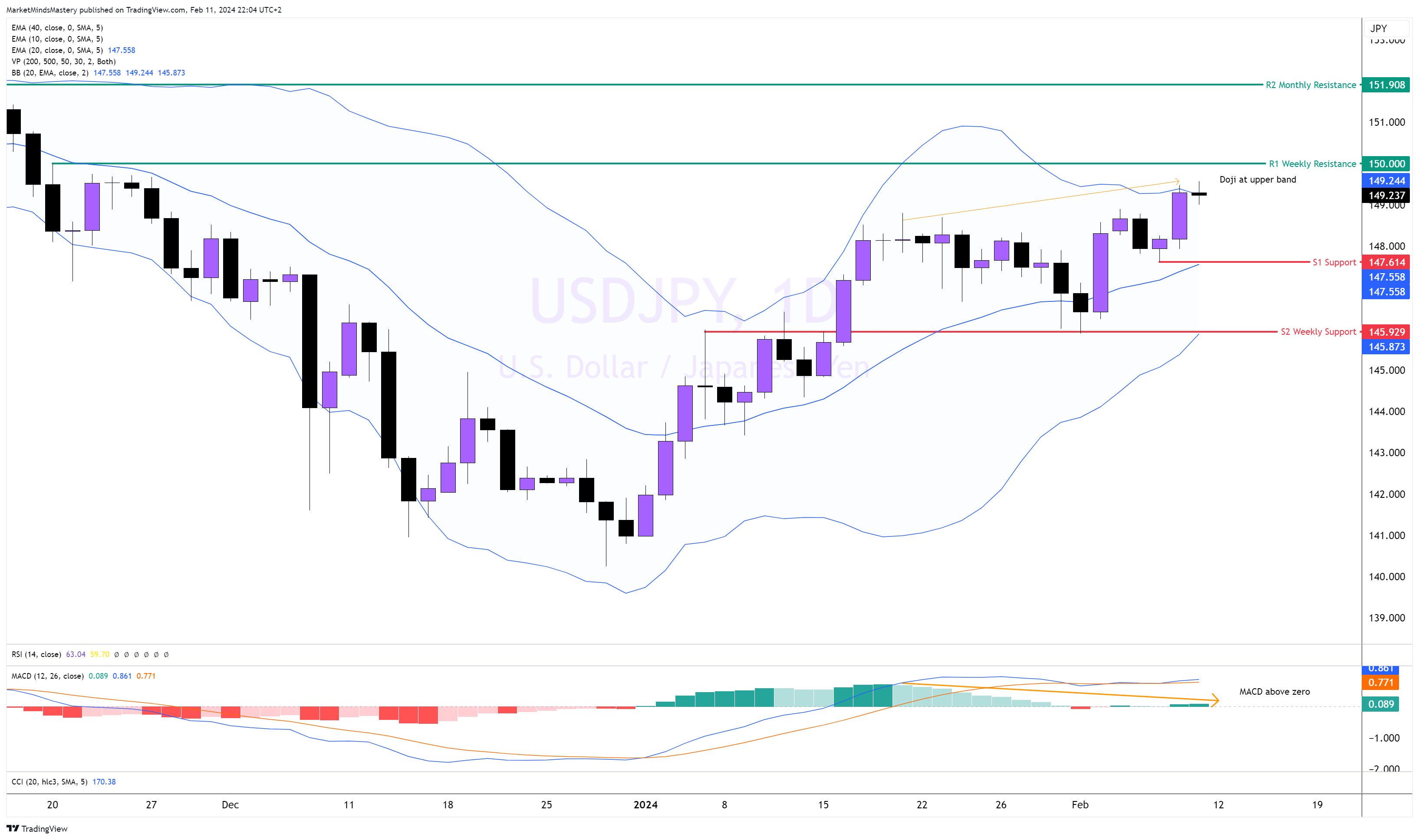 Fundamentalmente, se prevé que el dólar sea una divisa débil y que el PIB de Japón mejore. Por lo tanto, si los acontecimientos en la escala macroeconómica favorecen al yen y simultáneamente, en EE.UU., el dólar se debilita. De ahí que el USDJPY sea susceptible de un descenso a corto plazo. El precio sigue marcando máximos y mínimos más altos. Está cotizando por encima de la media móvil de 20 periodos, lo que indica una tendencia alcista. El MACD también muestra un sesgo alcista, y el histograma muestra divergencias bajistas. La acción del precio muestra una vela Doji justo después de una larga vela alcista dentro de una tendencia alcista. Si el precio baja temporalmente, la primera zona de soporte será la MA dinámica de 20 periodos del indicador Bollinger Band. Si el precio se mueve por debajo, encontrará el soporte S1 en torno a 147,614.