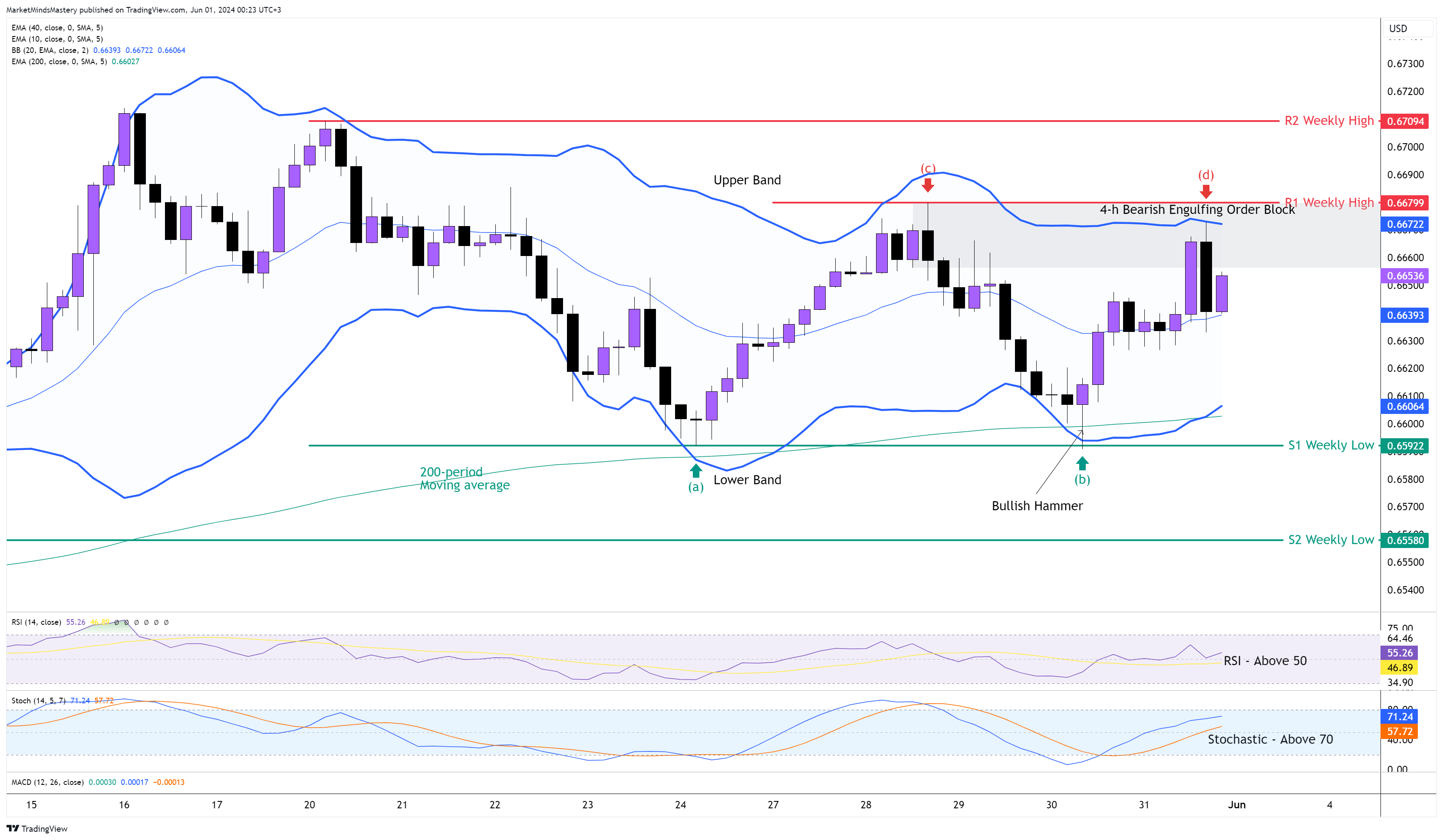 Il prezzo ha trovato supporto al supporto Inside, che abbiamo indicato come S1 nelle prospettive di mercato della settimana precedente. Ha rimbalzato con una doji dragonfly e si è mosso al rialzo. Sebbene abbia fatto un massimo e un minimo più alti, si è fermato al livello 200. Si tratta di un numero tondo che di solito attrae gli ordini di mercato. Mentre il prezzo si avvicina al recente swing high sul grafico a 4 ore, il MACD mostra debolezza sotto forma di divergenze negative di classe B. La media mobile a 20 periodi è al di sopra di quella a 50 periodi, ed entrambe sono al di sopra della media mobile a 200 periodi. Nonostante le divergenze negative mostrate dal MACD, la linea MACD si è incrociata al di sopra della linea di segnale, ed entrambe sono al di sopra dello zero, il che conferma lo slancio rialzista della valuta. Se il prezzo continua a salire, la prima area di resistenza sarà R1, ovvero il massimo della settimana precedente. Si trova intorno a 200,56.
