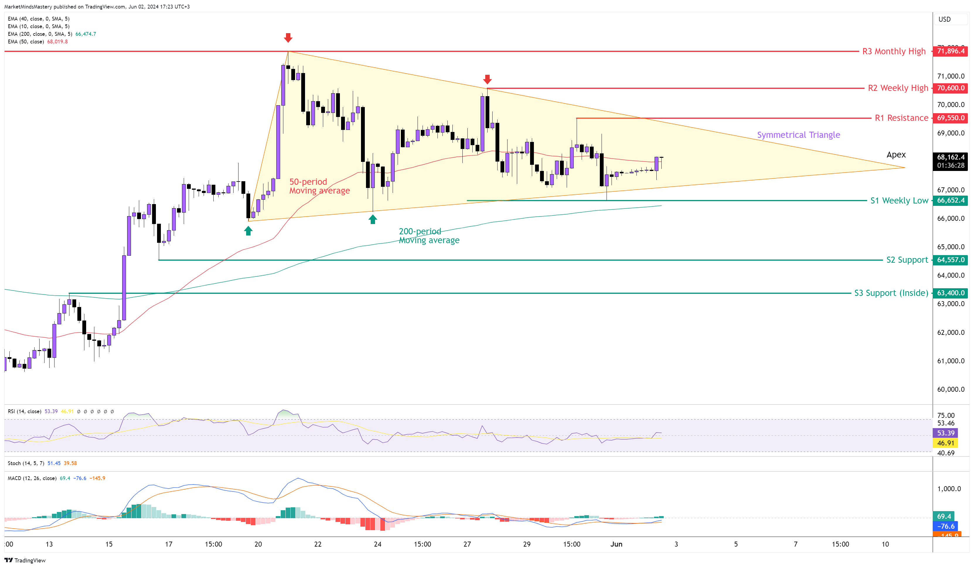 A partire da lunedì, se il prezzo si muove e rompe al di sopra della linea superiore del triangolo simmetrico, la prima resistenza è una R1, che sarà intorno a 69550 dollari. Se il prezzo penetra nell'area R1 e si muove oltre, la prossima area di resistenza R2 sarà 70600, che è il massimo della settimana precedente.
