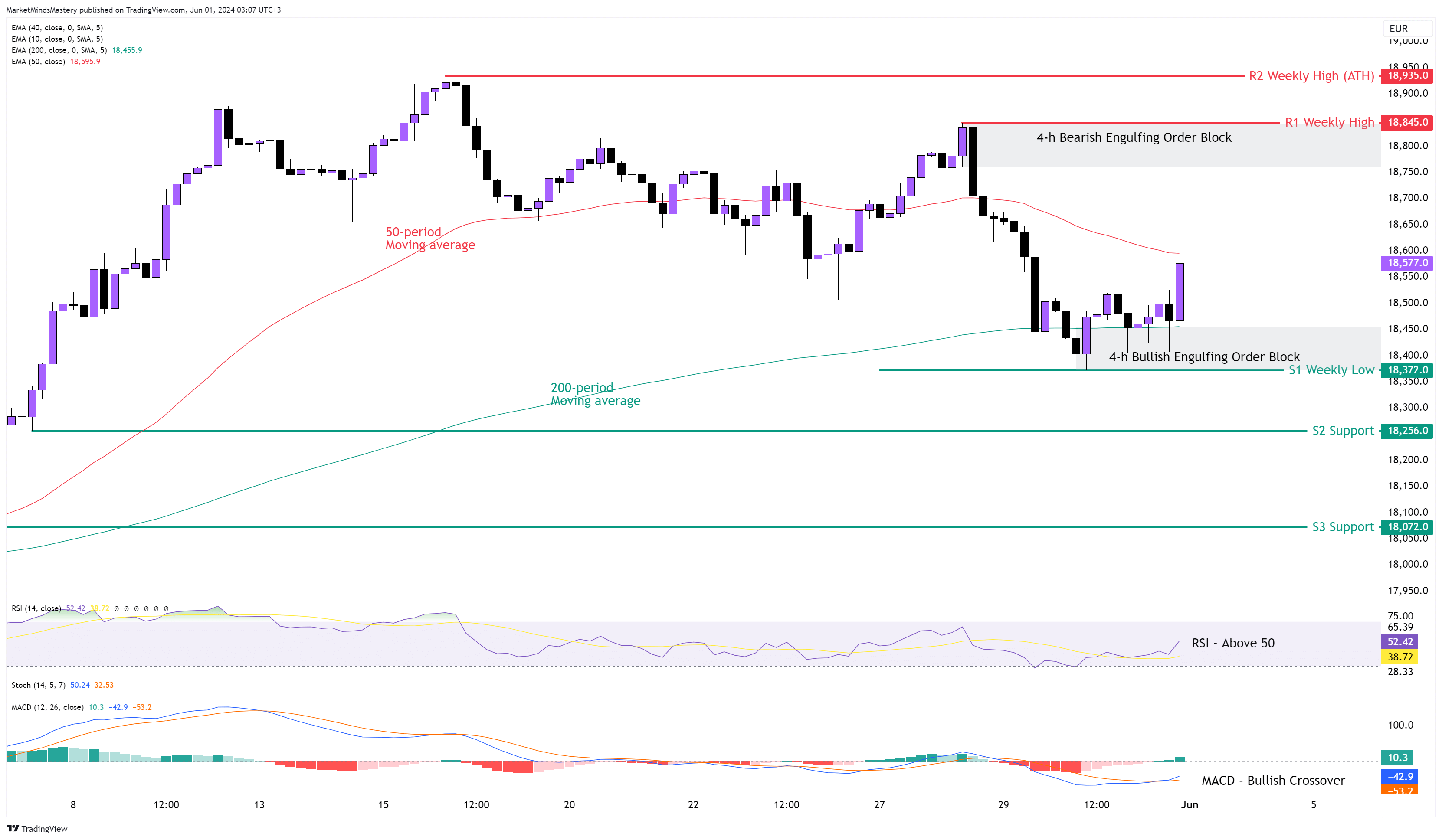 Da lunedì, se il prezzo continuerà a muoversi verso l'alto e chiuderà sopra la media mobile a 50 periodi, troverà la prima resistenza R1, intorno a 18845. A questo livello, la scorsa settimana è stato creato un Bearish Engulfing Order BLock che può rappresentare un'attrazione significativa per gli ordini di mercato. Se il prezzo penetra la R1 e chiude al di sopra di essa, la prossima resistenza, R2, sarà l'All-Time High (ATH) intorno a 18935.