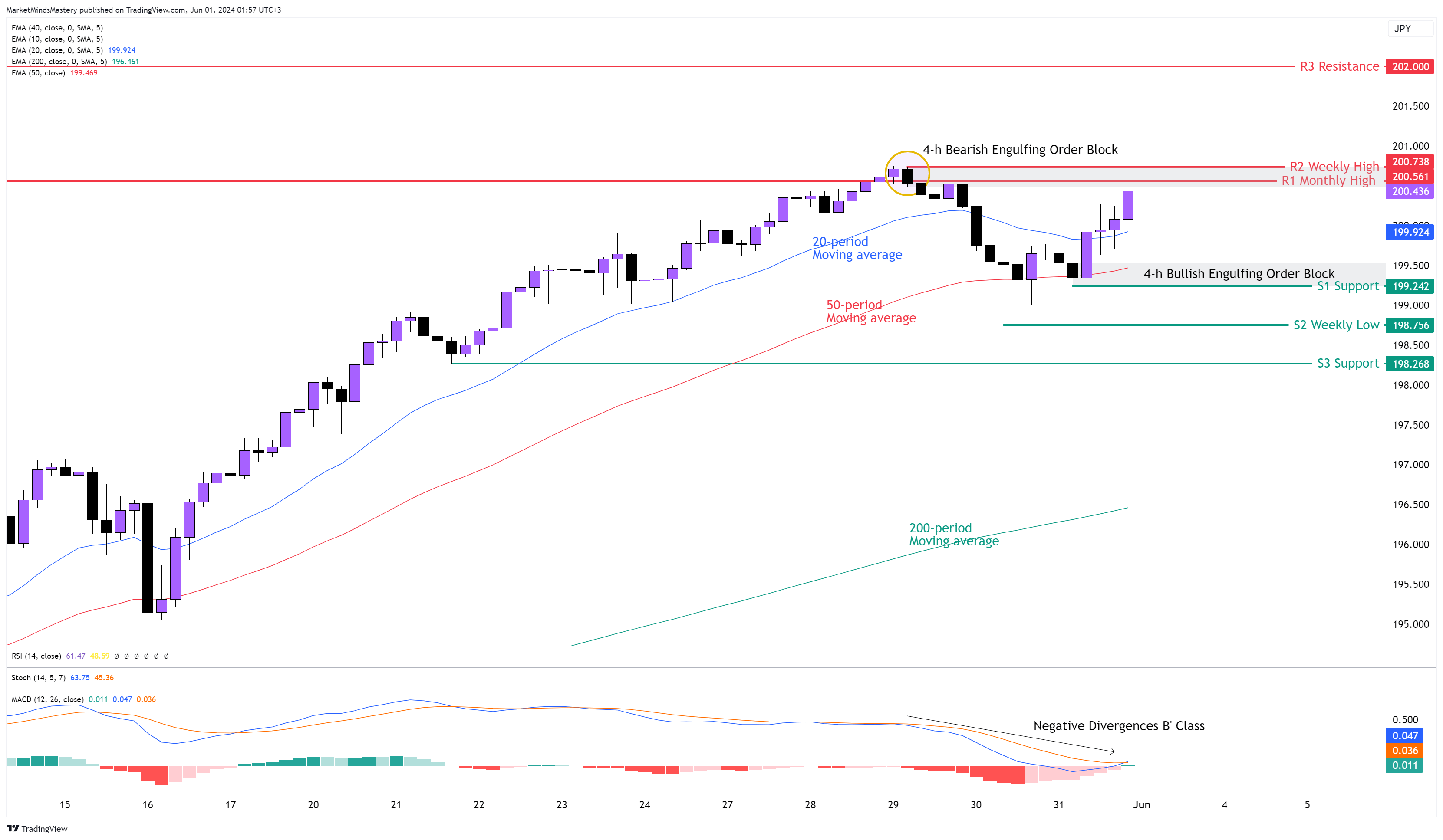 Meno di 20 pips più in alto si trova la prossima resistenza, la R2, che è il massimo dell'ultimo mese, intorno a 200,73. Guardando attentamente tra i due livelli, il prezzo ha formato un Bearish Engulfing Order Block. Questa può essere un'area significativa perché se tiene, il prezzo dovrebbe scendere in modo aggressivo, o se si rompe, il prezzo dovrebbe creare una lunga candela rialzista e il livello successivo dovrebbe invertire il ruolo e diventare un supporto. Se il prezzo rompe R2 e si muove più in alto, il prossimo livello di resistenza, R3, sarà intorno a 202. Al contrario, se il prezzo diminuisce e si muove verso il basso, la prima area di supporto S1 si trova intorno a 199,24. Questo livello si trova intorno al 50-percento. Questo livello si trova intorno alla media mobile a 50 periodi e il blocco di ordini è stato creato venerdì scorso. Il prossimo livello di supporto sarà S2, che è il minimo della settimana precedente, intorno a 198,75.