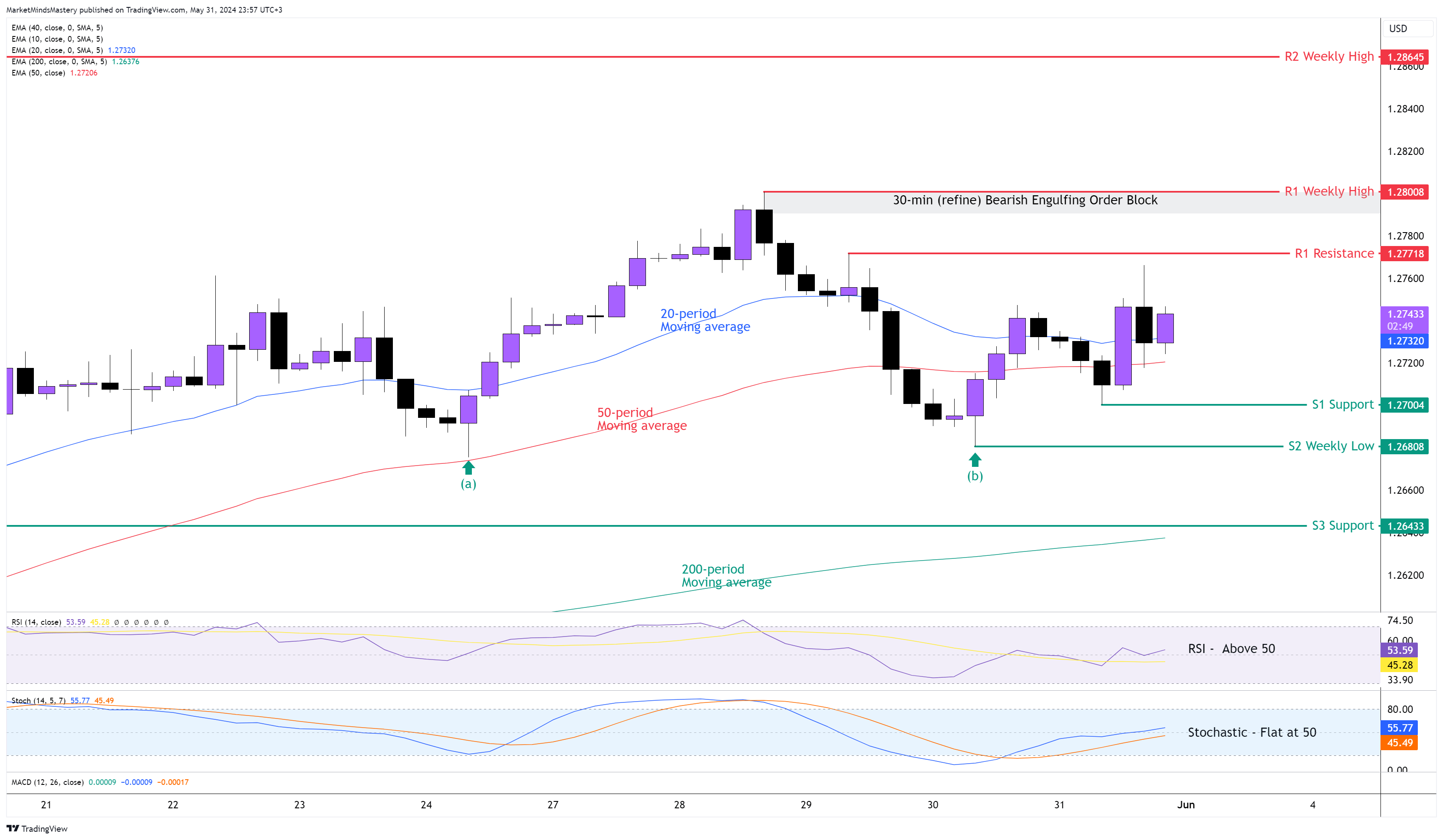 La scorsa settimana, la sterlina si è mantenuta forte contro il dollaro USA e ha creato un massimo e un minimo più alti sul grafico settimanale. Sul grafico a 4 ore, il periodo 20 è al di sopra della media mobile a 50 periodi, e il 50 è al di sopra del 200. Tutti questi elementi hanno implicazioni rialziste. Mentre lo Stocastico oscillatore è piatto intorno alla linea centrale, l'RSI è sopra 50, indicando turbolenza. La debolezza è mostrata al punto (b) utilizzando la swing analysis. Questo livello di prezzo aveva un blocco d'ordine Engulfing rialzista segnato dall'analisi delle prospettive di mercato della scorsa settimana. Il prezzo ha scambiato fino a questo Order Block e giovedì scorso è stata stampata una candela di inversione Bullish Engulfing. Tuttavia, il prezzo non ritraccia il 100% del suo movimento in un forte trend rialzista. Ciò può indicare una debolezza in questa coppia di valute, poiché il minimo in (a) è uguale al minimo in (b). Se il prezzo aumenta, la prima resistenza sarà intorno a 1,27718, contrassegnata come resistenza R1 sul grafico. Se il prezzo rompe e chiude al di sopra di R1, l'area di resistenza successiva, R2, sarà 1,28. Questo livello ospita un blocco di ordini, come mostrato sul grafico, e può essere un'area significativa dove vengono piazzati molti ordini di acquisto e vendita. Se il prezzo scende e si muove più in basso, la prima area di supporto, S1, sarà 1,27. Un ulteriore movimento verso il basso, troverà la prossima area di supporto, S2, intorno a 1,26808, il minimo della settimana precedente.