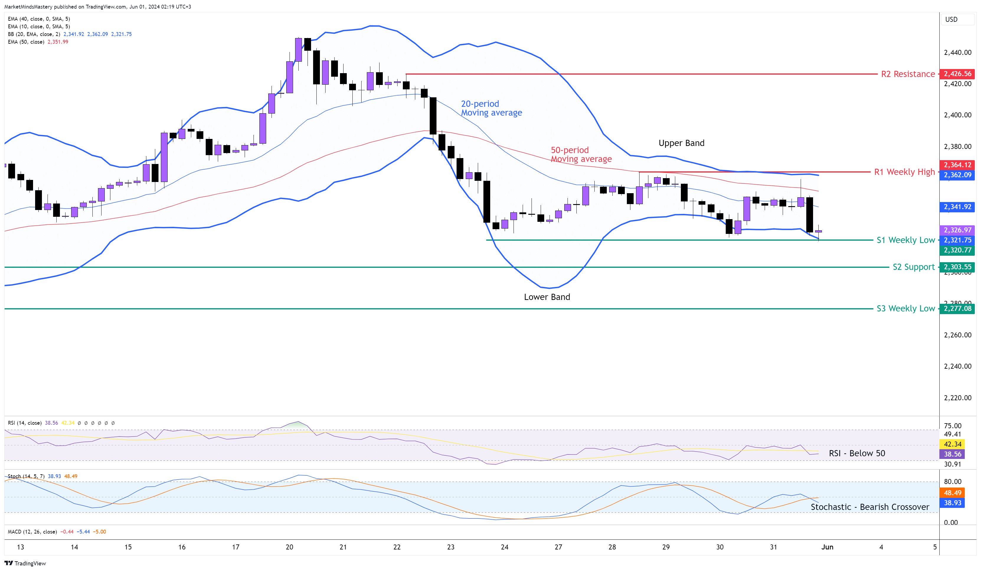 A partire da lunedì, se il prezzo crea un breakout ribassista, la prima area di supporto sarà il minimo della settimana precedente, intorno ai 2320 dollari. Un ulteriore movimento al ribasso può portare il prezzo al supporto successivo, S2, intorno a $2300, e ogni ulteriore spinta al ribasso porta al supporto S3, intorno a $2277, un vecchio minimo settimanale.
