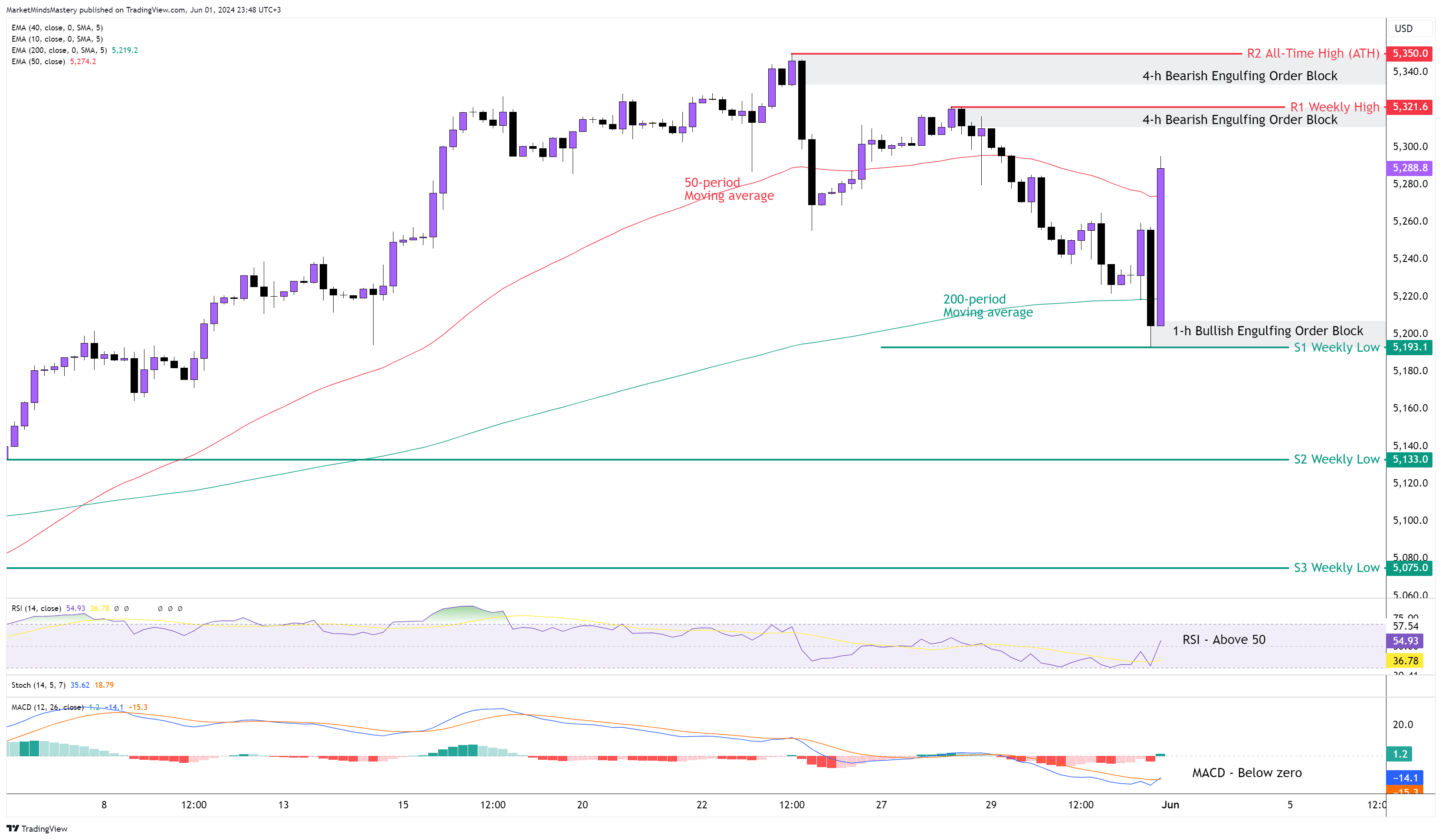 A partire da lunedì, se il prezzo si muove verso la tendenza settimanale (primaria), la prima area di resistenza, R1, sarà il 5321, che è il massimo della settimana precedente, come abbiamo detto prima. Se il prezzo penetra in R1 e si muove oltre, la prossima area di resistenza, R2, sarà l'All-Time High (ATH) intorno a 5350. In combinazione con il Bearish Engulfing Order Block, questo livello può essere un punto interessante per i trader.