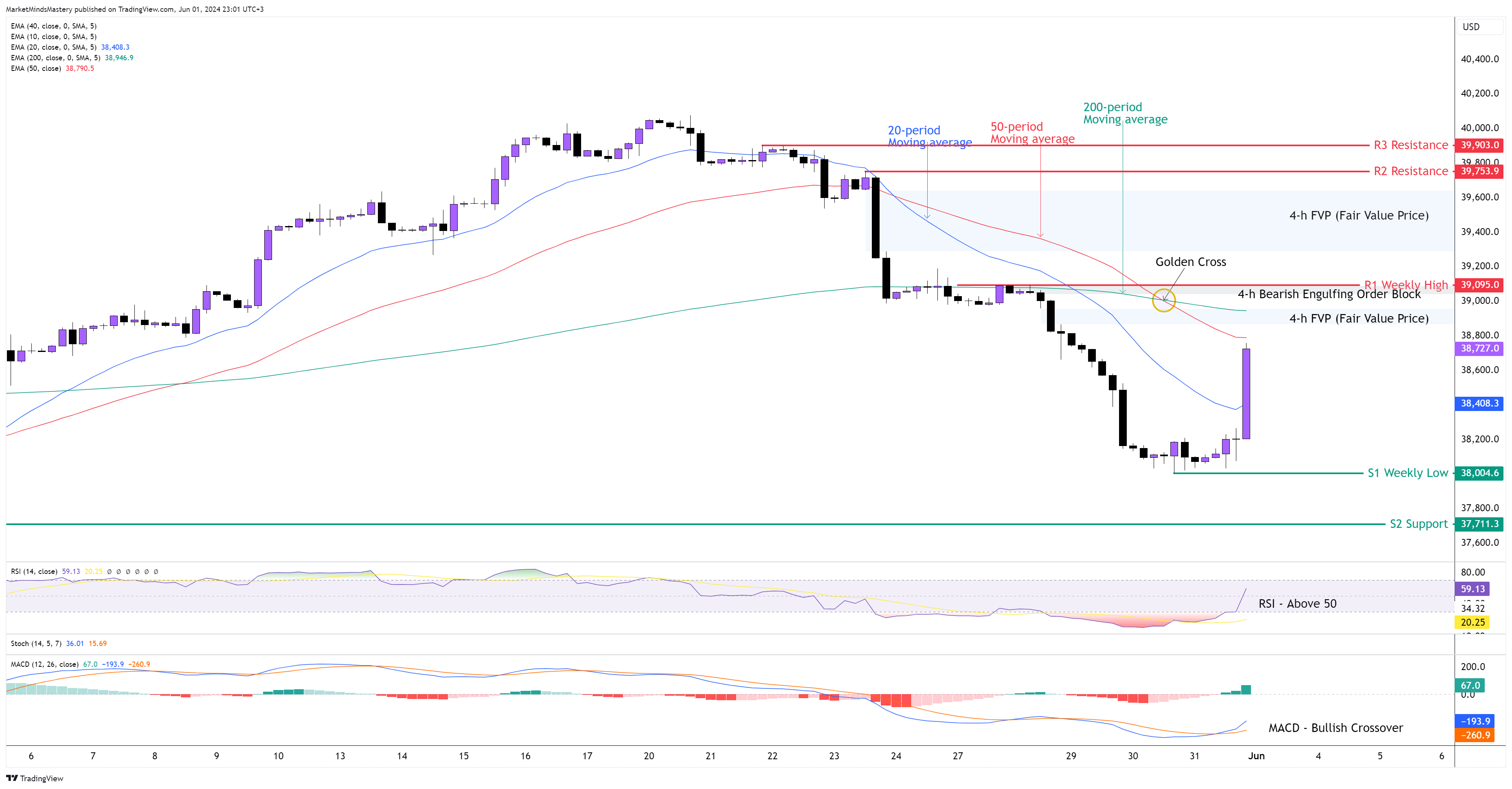 Consideriamo il grafico settimanale il trend primario in questo caso di studio. Da un punto di vista tecnico, il prezzo si trova in una tendenza al rialzo. Se il prezzo si muove al rialzo, sul grafico a 4 ore, la prima area di resistenza, R1, si trova a circa 39100. Il FVP mostrato sul grafico e il Bearish Engulfing Order Block indicano che l'attività di trading sarà intensa. Se il prezzo penetra il livello R1 e si muove verso l'alto, la prima cosa che ci si aspetta che accada è che il mercato giri verso l'alto e si allinei al trend rialzista settimanale. In questo caso, il prezzo può entrare nel 4-H FVP e raggiungere la resistenza R2 intorno a 39753.