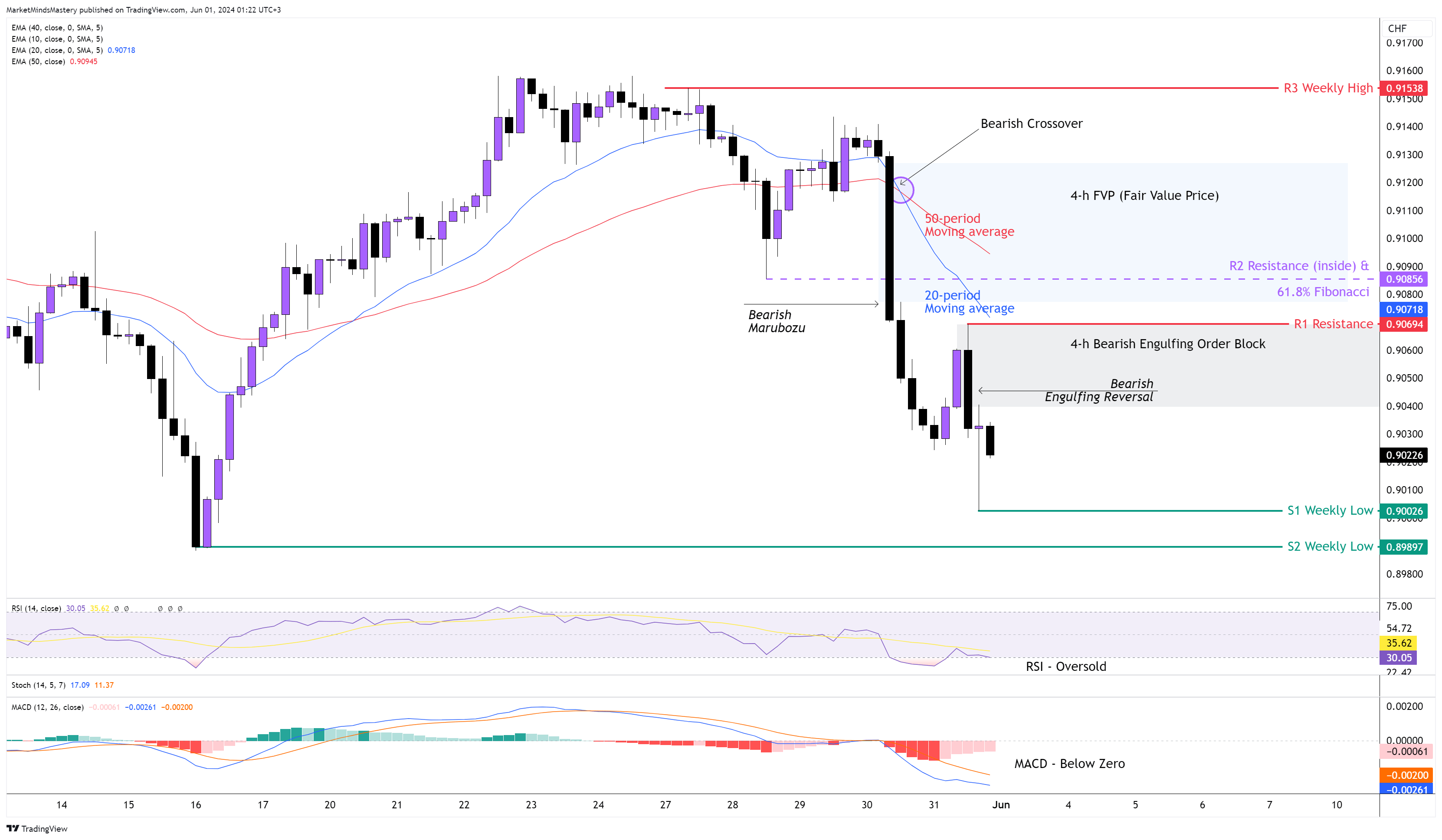 L'oscillatore RSI è in una condizione di ipervenduto, indicando un'estrema pressione di vendita. Il MACD è sotto la linea dello zero e questo ha implicazioni ribassiste. Il prezzo ha creato una serie di massimi e minimi inferiori, con il candela Marubozu bearish che è stato la forza trainante dietro il movimento impulsivo verso il basso. Si sono lasciati alle spalle un FVP a 4 ore e un Order Block creato da una candela Bearish Engulfing venerdì scorso.