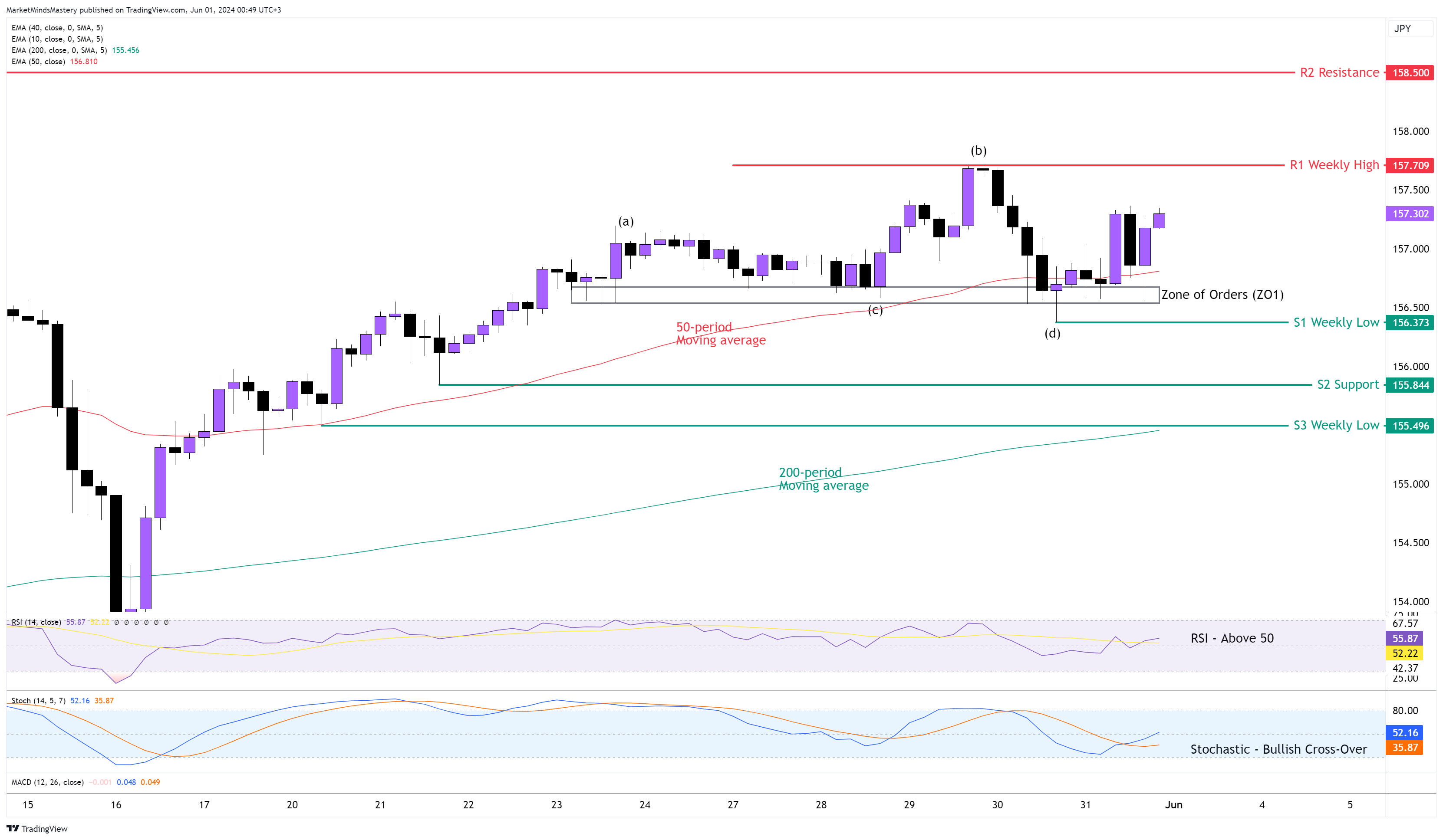 Si è conclusa un'altra settimana rialzista per l'USDJPY. Nonostante l'aumento del CPi in Giappone, lo yen non ha mostrato forza e l'USD ha preso il sopravvento, creando un nuovo massimo settimanale e una nuova chiusura. Confrontando le candele settimanali, la candela della scorsa settimana ha un corpo molto piccolo, il che significa una mancanza di slancio rialzista. Sul grafico a 4 ore, il prezzo ha creato un alto, come mostrato ai punti (a) e (b), ma un basso ai punti (c) e (d). Sebbene il minimo al punto (d) sia stato un falso breakout, il trend rialzista deve essere messo in discussione. La media mobile a 50 periodi è al di sopra di quella a 200 periodi. Il prezzo è rimbalzato sulla media mobile a 50 periodi giovedì e venerdì della scorsa settimana. L'oscillatore RSI è al di sopra di 50, indicando una tendenza rialzista. Lo Stocastico ha creato un crossover rialzista, un'altra indicazione rialzista.
